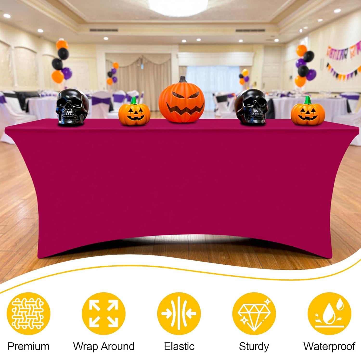 [Elastic & Full Coverage] Smiry elastic tablecloth is made of high-quality 90% polyester and 10% spandex, offering excellent stretchability. Its unique design features four elastic leg pockets that securely accommodate folding table legs, ensuring complete coverage of every part of the rectangular table.