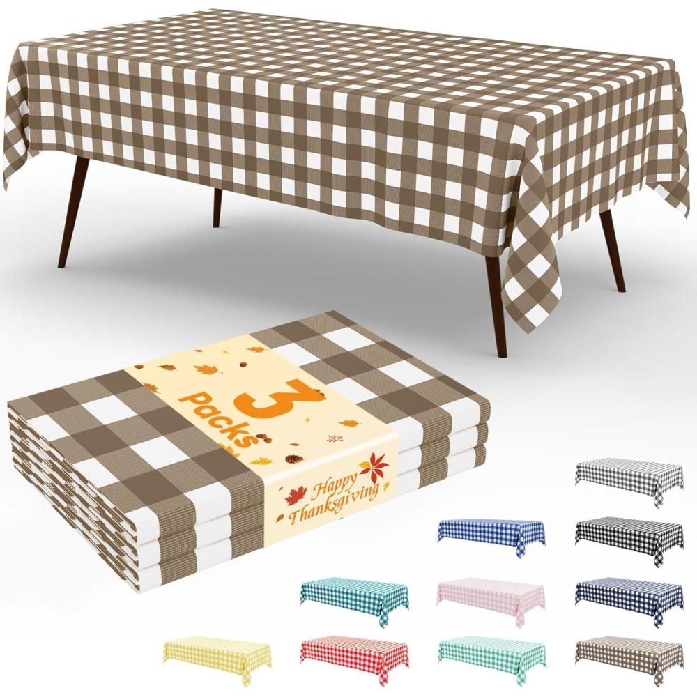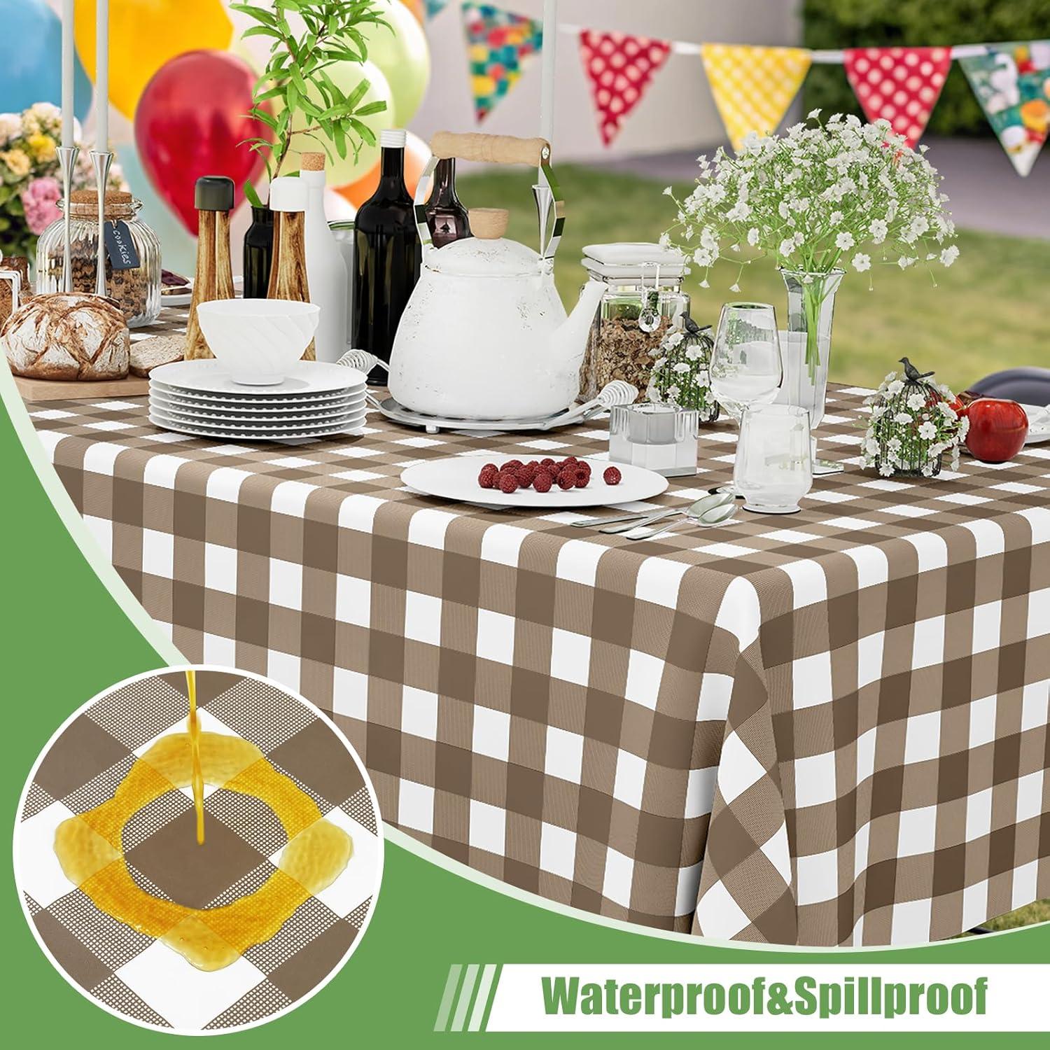 Smiry 3 Packs Gingham Disposable Table Cloth, 54 x 108 Inch Waterproof Plastic Tablecloth, Rectangle Khaki and White Checkered Table Covers for Picnic, Birthday, Party(Brown and White)