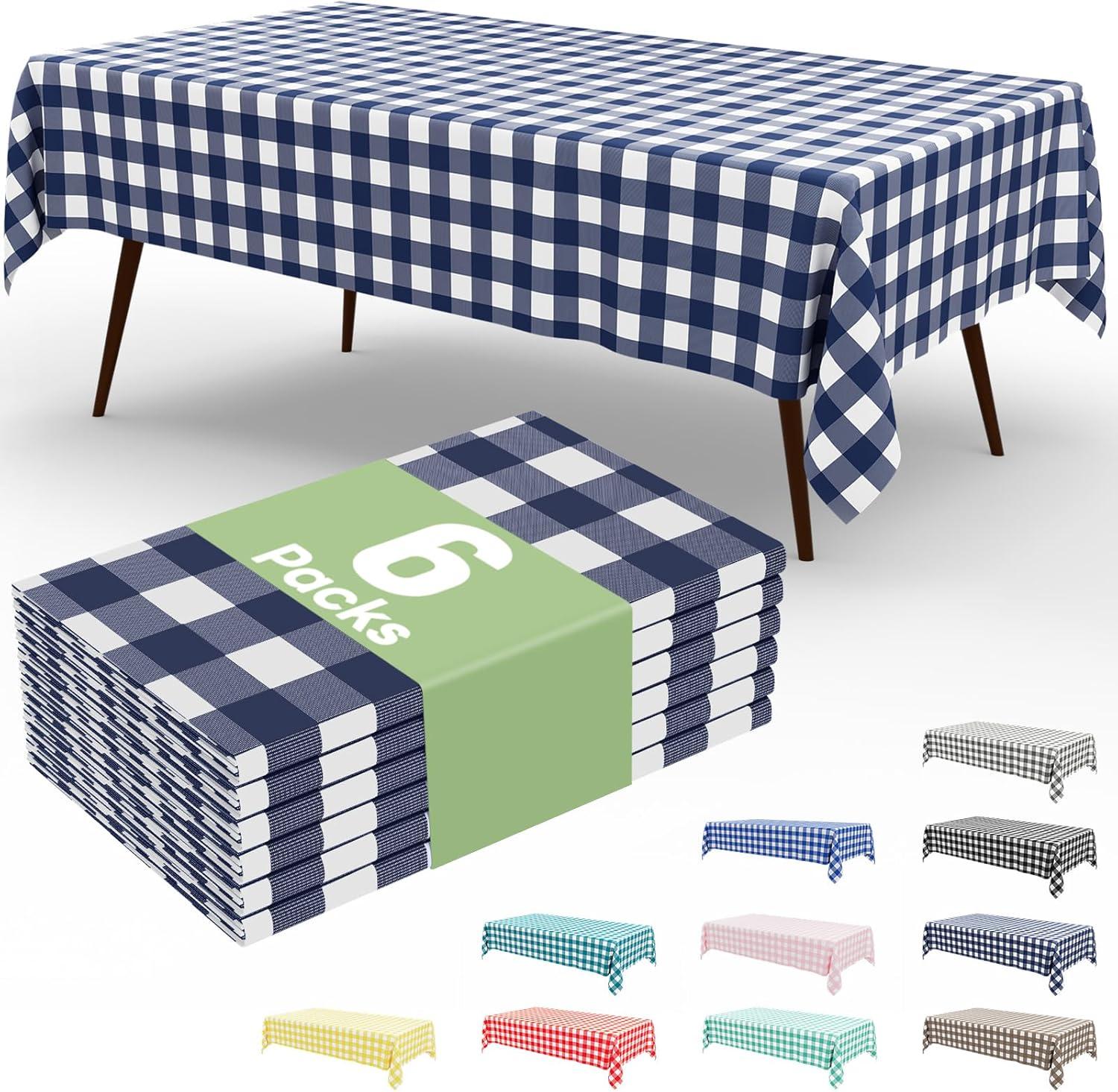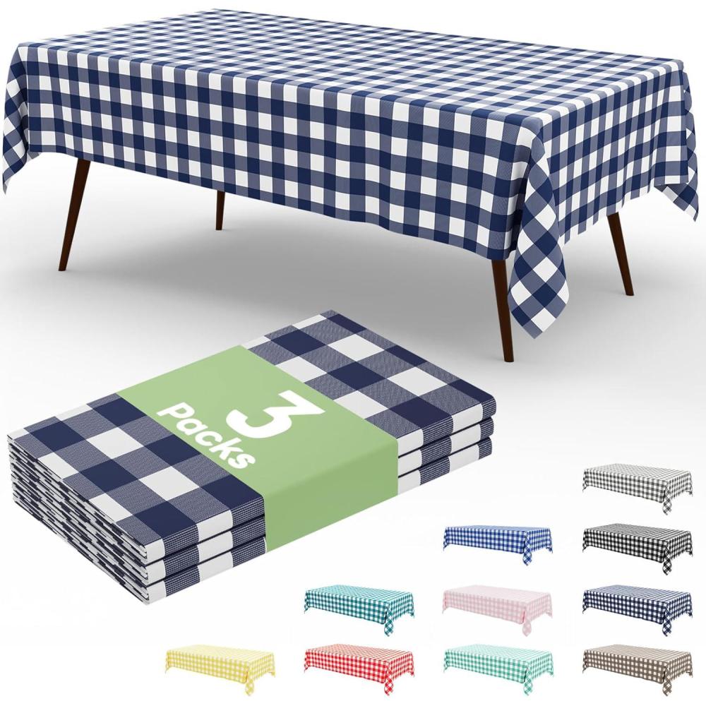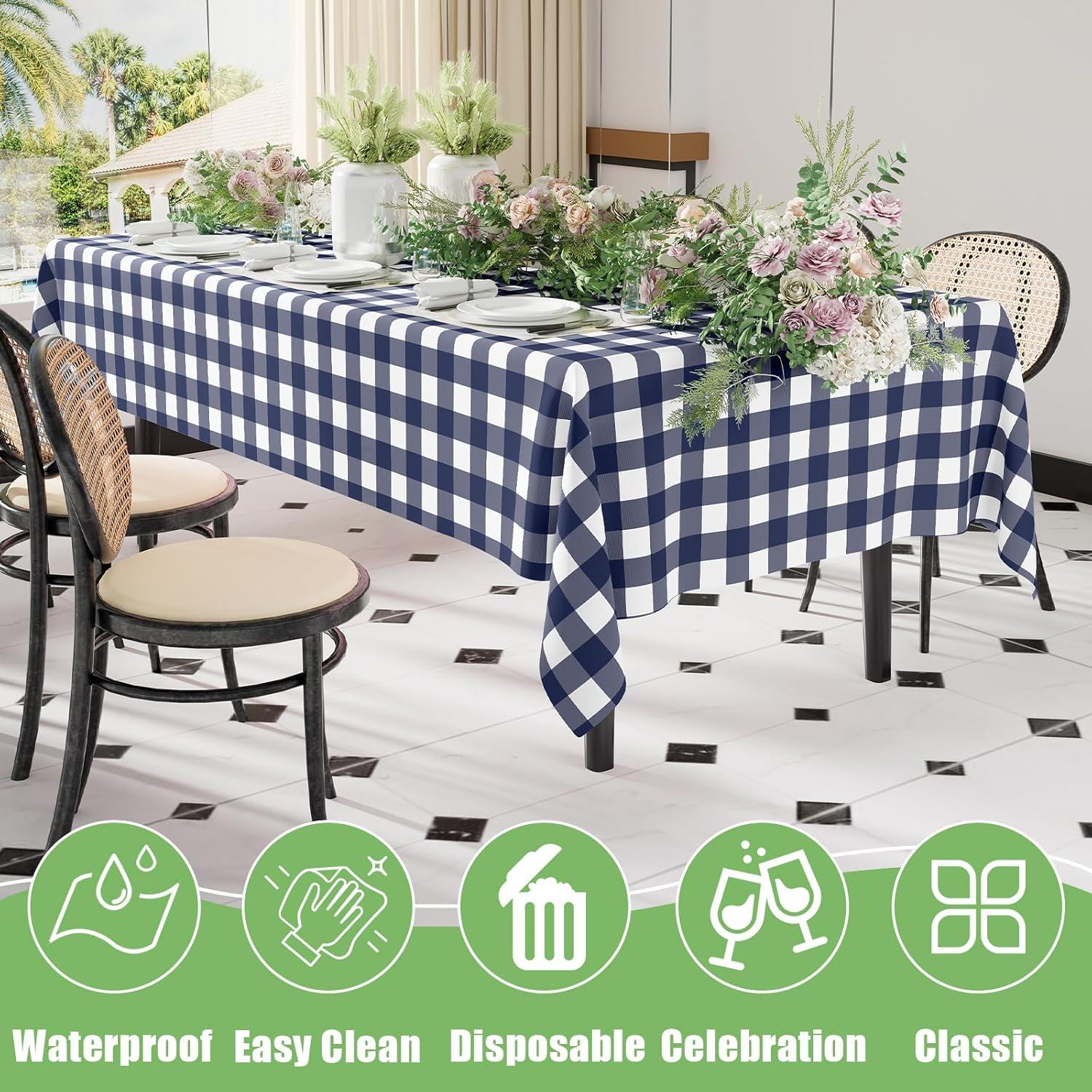 Smiry 3 Packs Gingham Disposable Table Cloth, 54 x 108 Inch Waterproof Plastic Tablecloth, Rectangle Khaki and White Checkered Table Covers for Picnic, Birthday, Party(Navy and White)