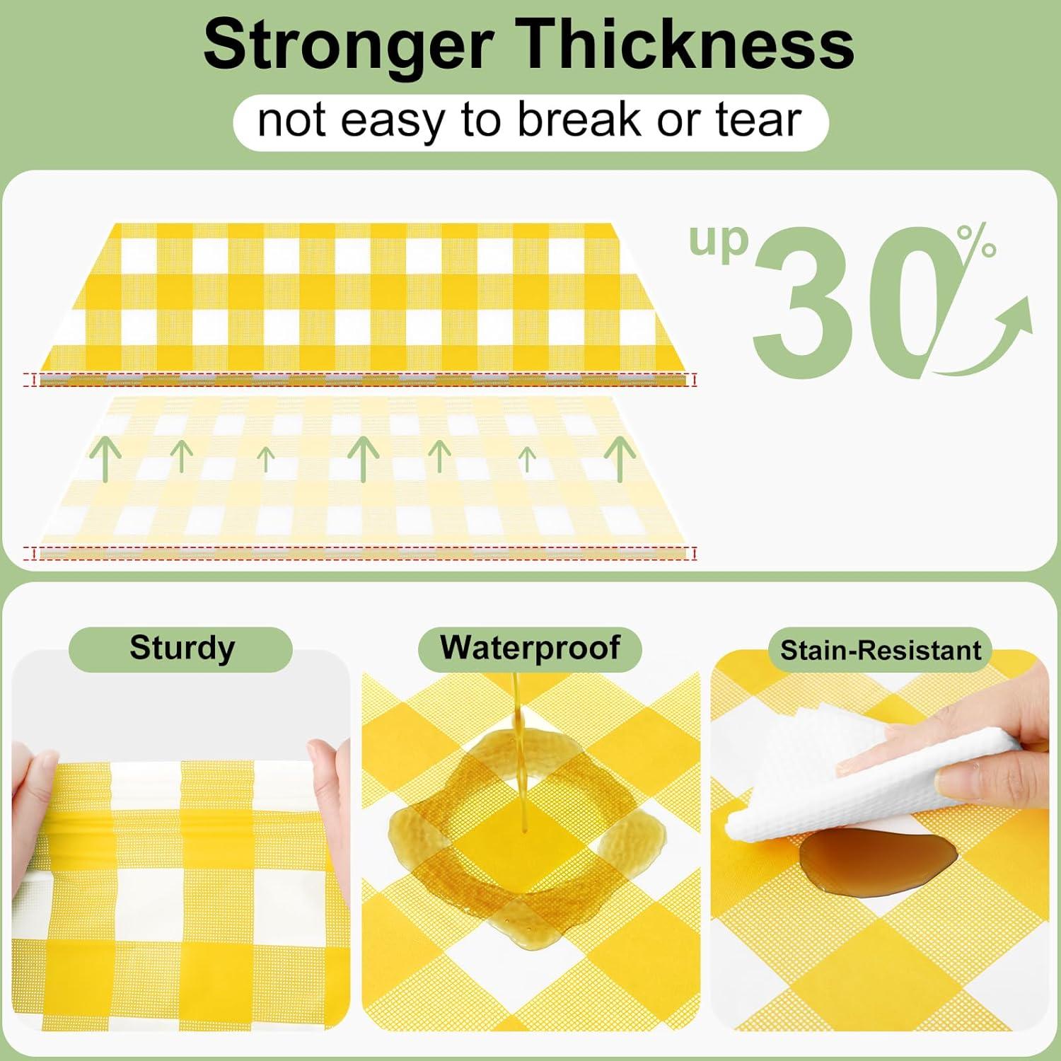 [Waterproof & Easy Clean] The surface of our plastic table cloth is waterproof, providing protection for your table from spills and stains. Simply wipe the tablecloth with a damp cloth to easily clean. After use, just dispose of it, and you're done!