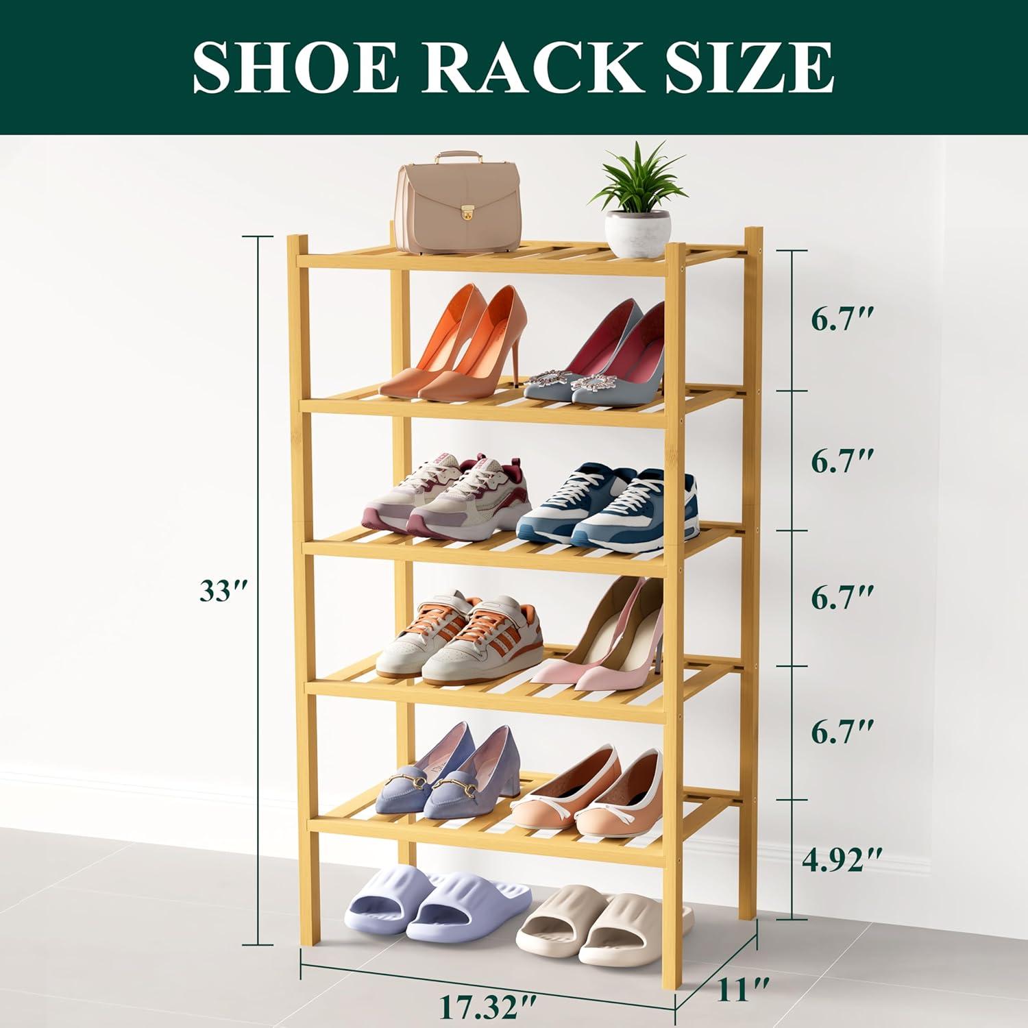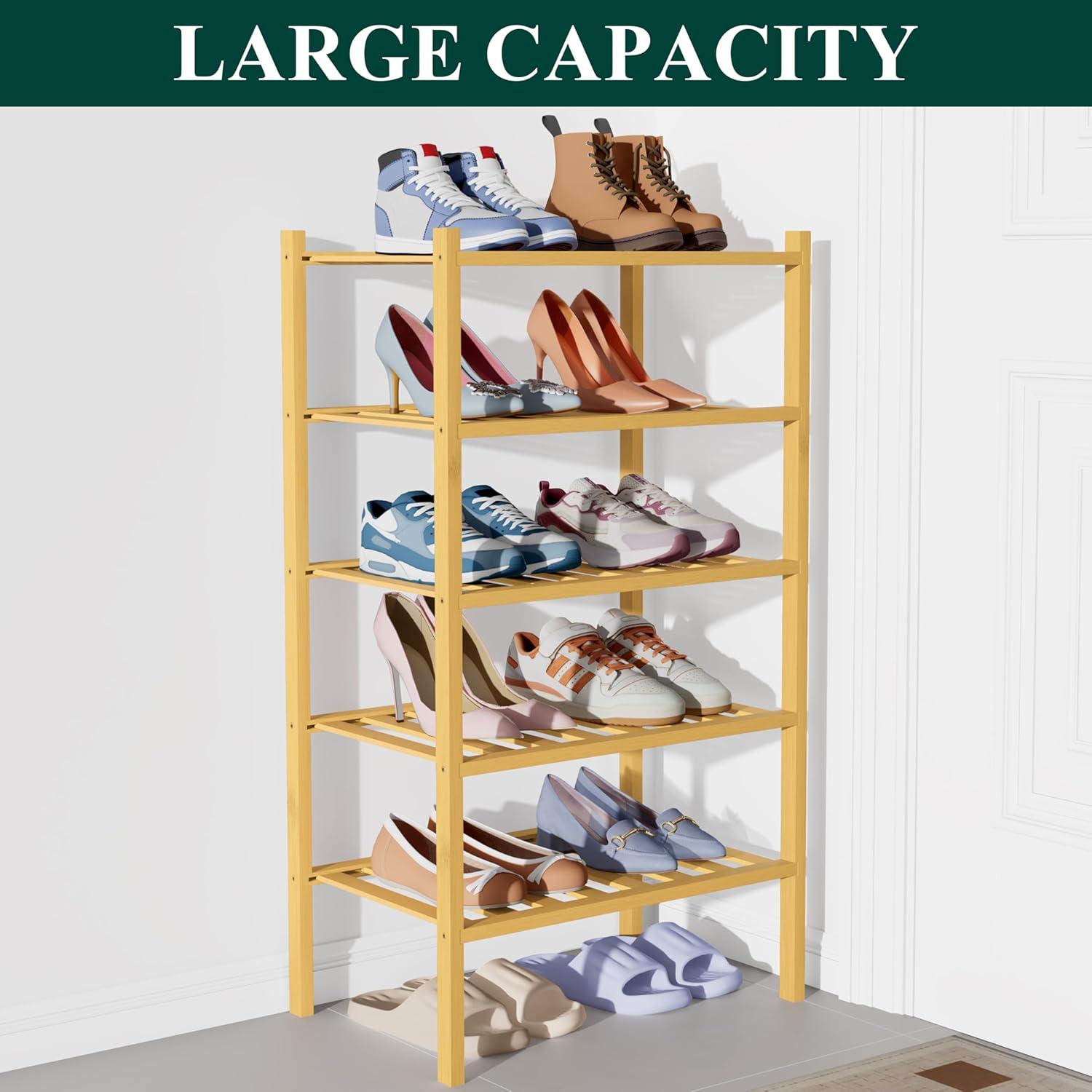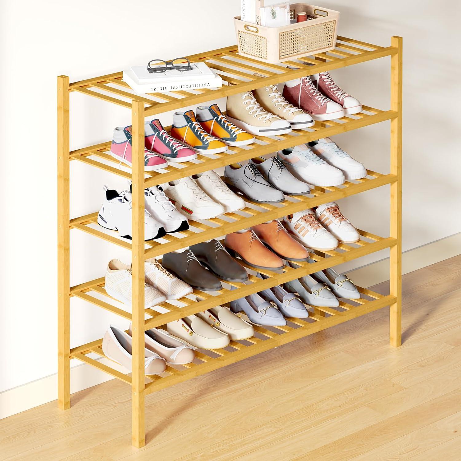 Smiry Bamboo Shoe Rack for Closet, 5 Tier Wooden Stackable Shoe Organizer, Free Standing Shoes Storage Shelf for Entryway, Front Door Entrance, Brown(Natural)