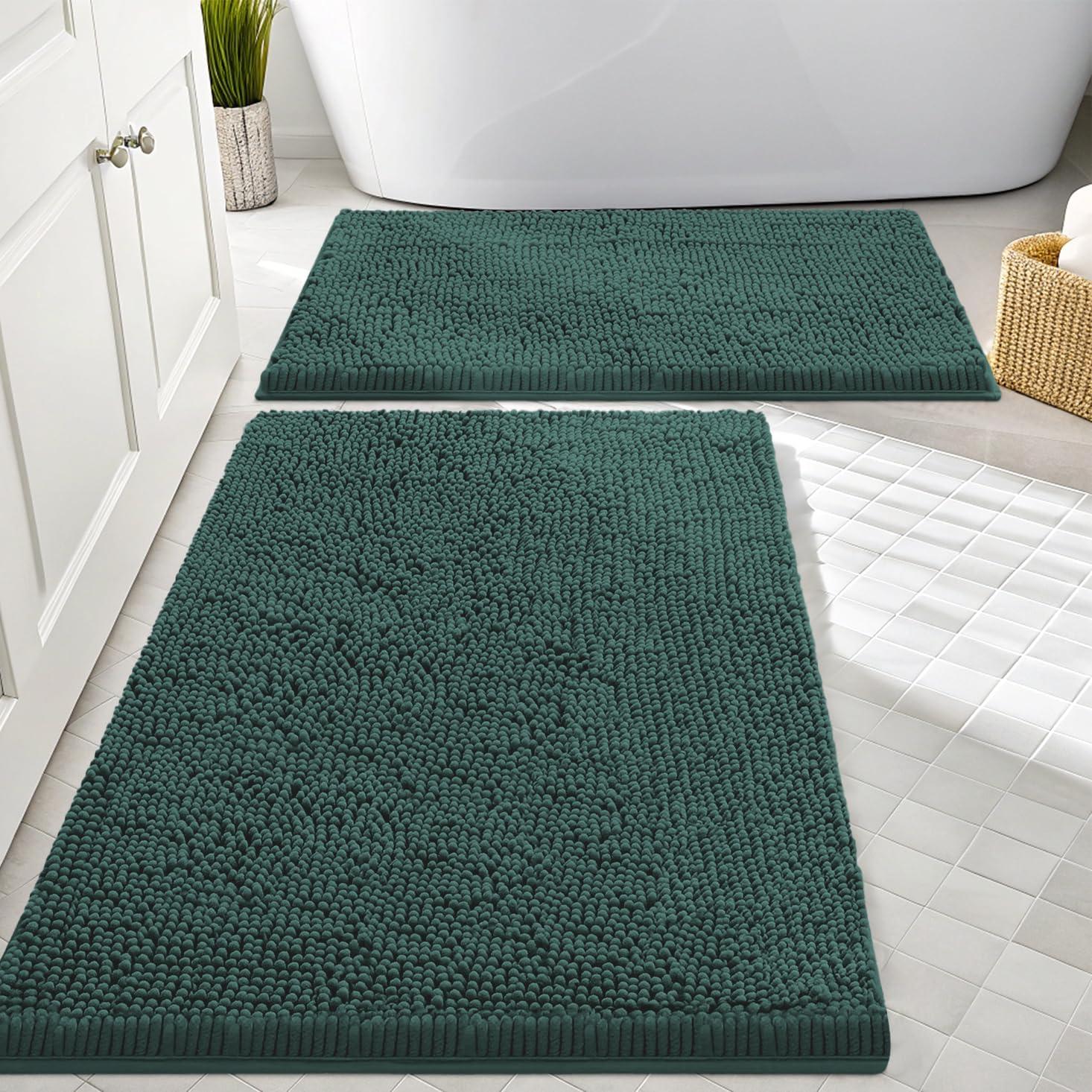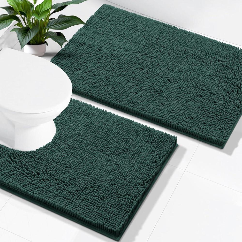 Smiry Bathroom Rugs Set 2 Piece, Soft Absorbent Chenille Bath Mat and U-Shaped Toilet Rug Set, Non Slip Shaggy Bath Carpet for Tub, Shower and Floor (30×20+24×20, Black)(Green)