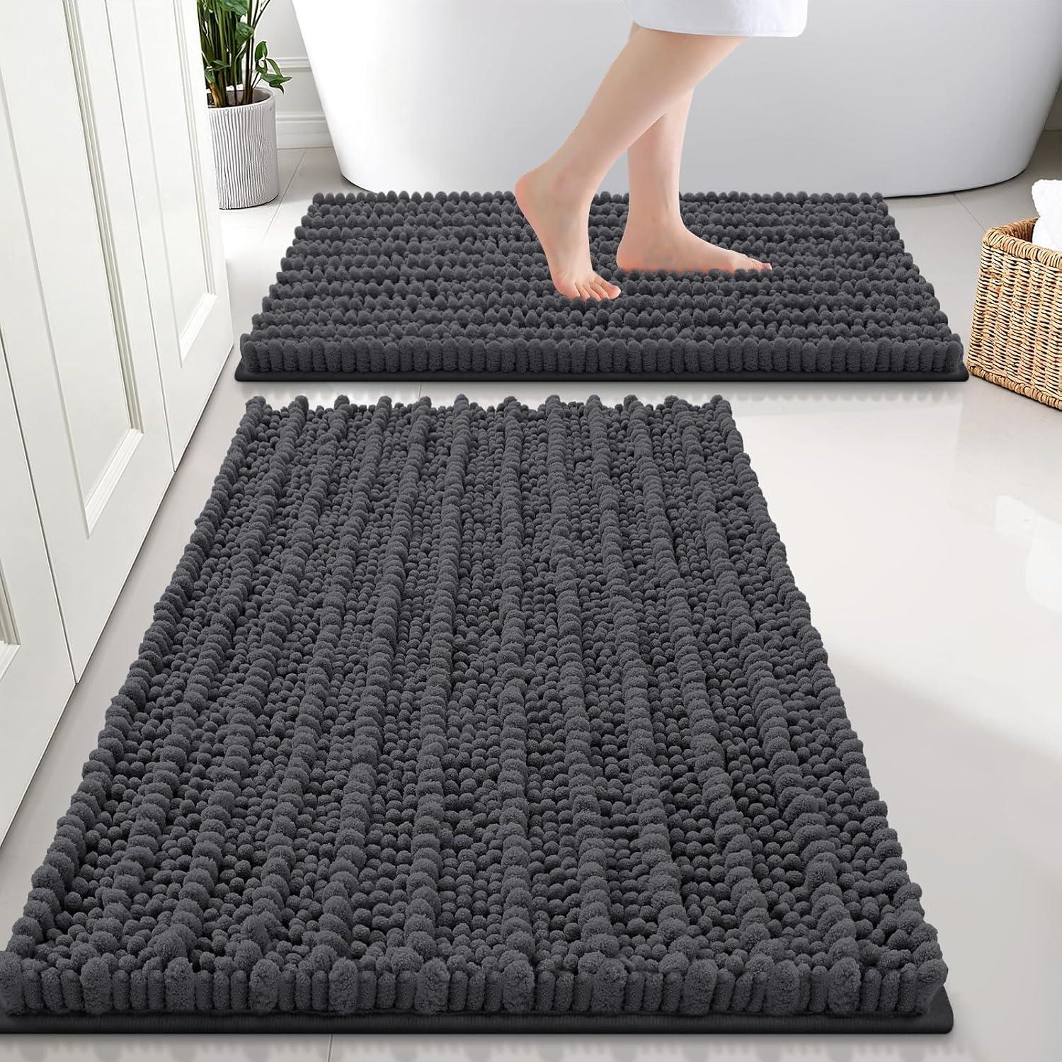 Smiry Bathroom Rugs Set 3 Piece, Soft Absorbent, Non Slip Rubber Backing Machine Washable Quick Dry Chenille Bath Rug Set for Tub, Shower, and Floor 47″ x 20″+30″ x 20″ +U-Shaped 24″ x 20″ Dark Grey