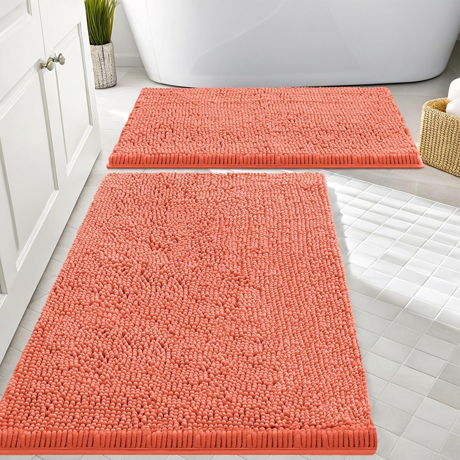 Smiry Bathroom Rugs Sets 2 Piece, Soft Absorbent Chenille Machine Washable Non Slip Shaggy Bath Rug Set for Tub, Shower, and Floor (34×21+30×20, White)(Coral)