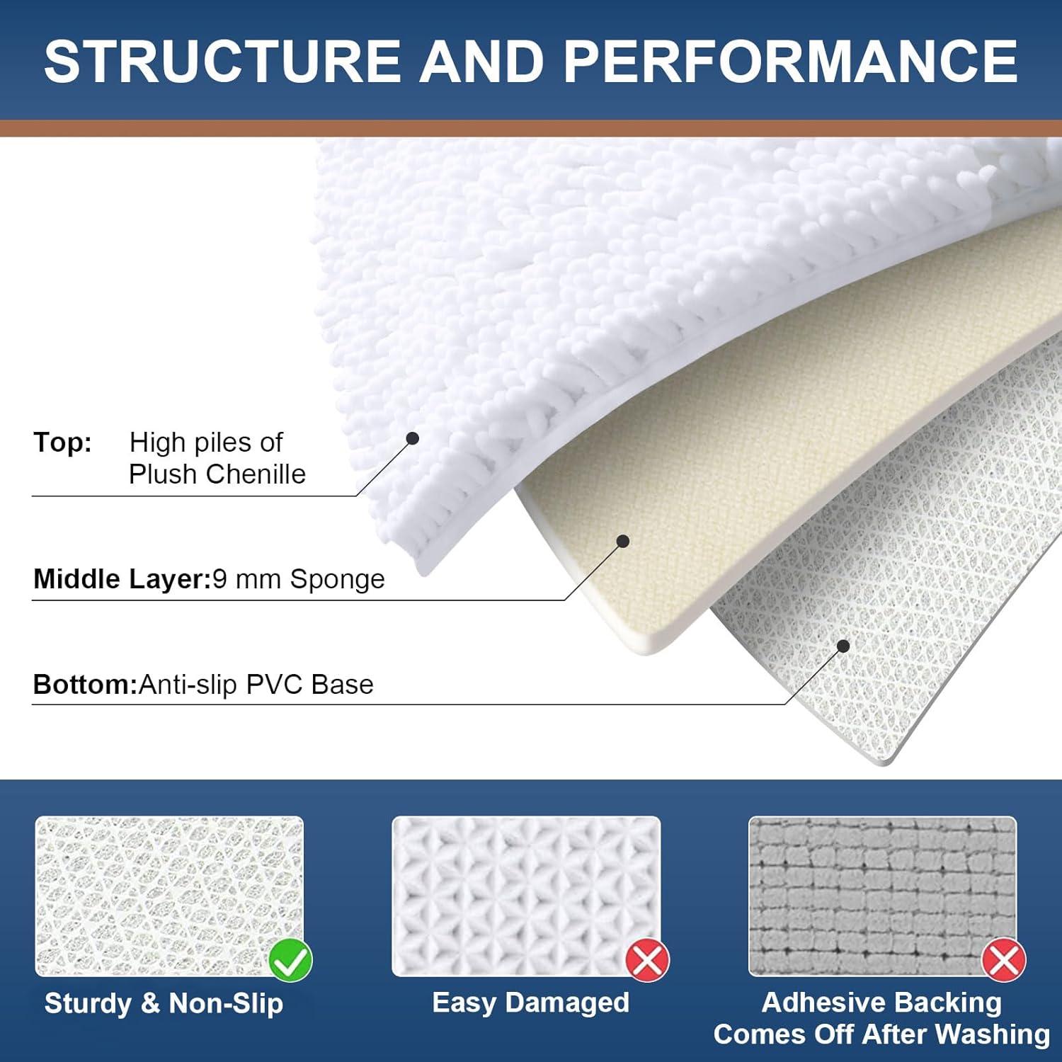 [Non-Slip Backing] Our bath rugs feature a non-slip backing made from high-quality mesh PVC, providing a secure grip that prevents shifting and skidding. Important: Place on CLEAN DRY FLAT FLOOR ONLY to avoid slipping. Keep the rug's bottom dry at all times.