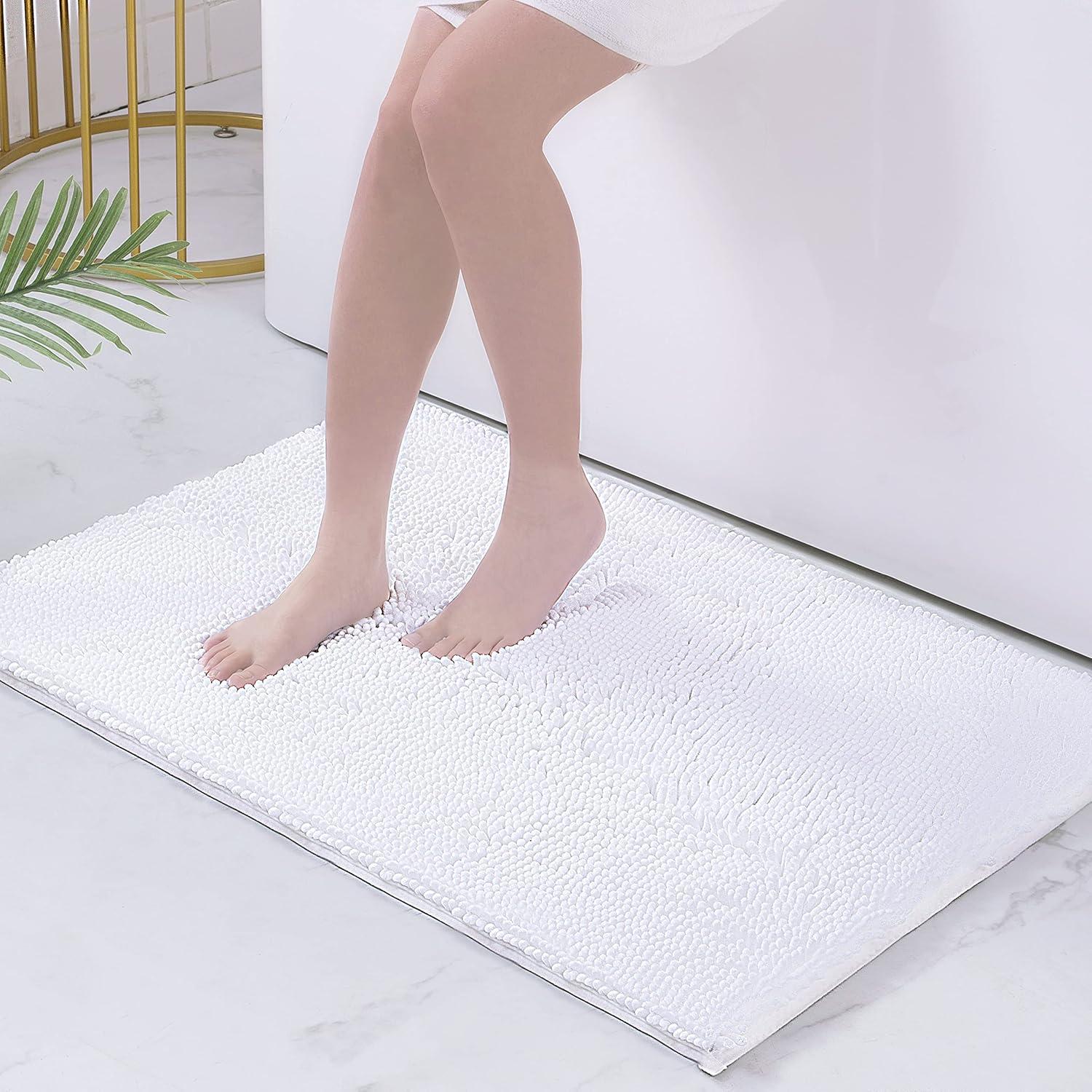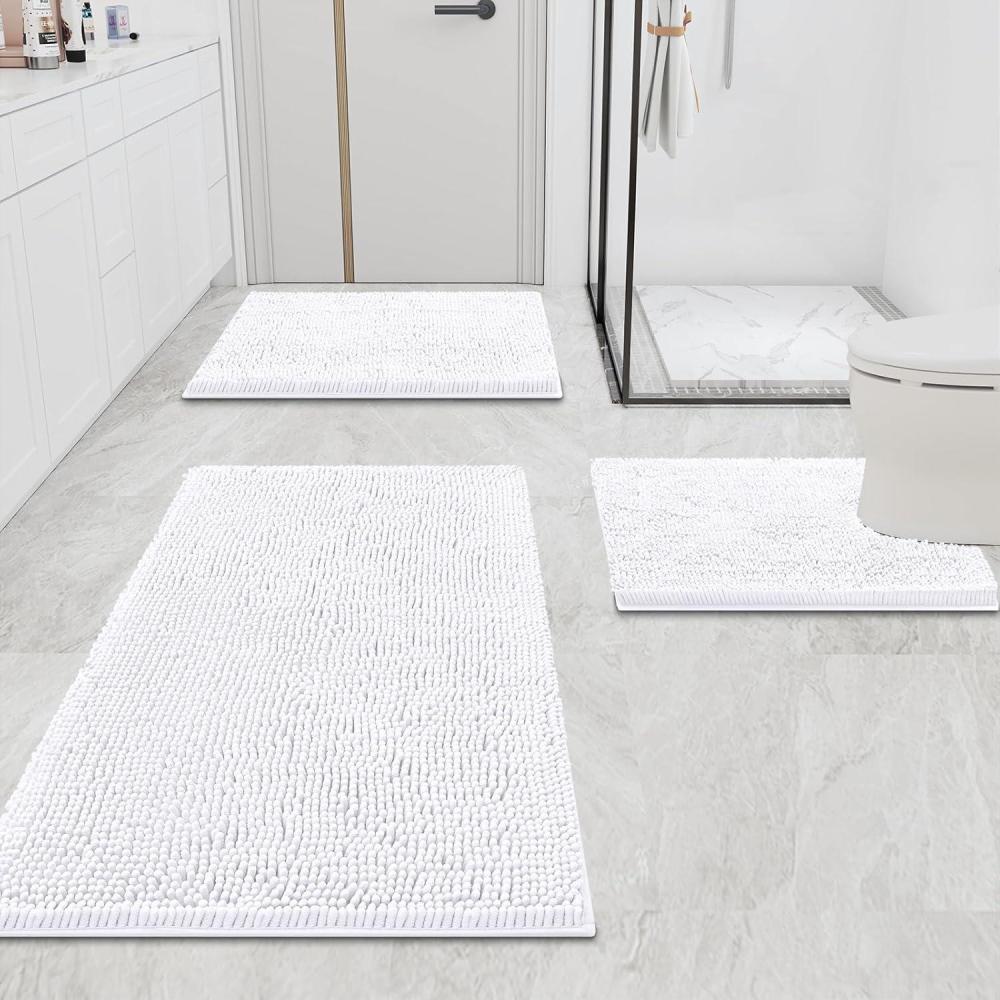 Smiry Chenille Bathroom Rugs and Mats Set of 3, Non Slip Absorbent Shaggy Bath Rug for Tub, Shower and Bath Room (36″x 24″+24″x 16″+U-Shaped 24″ x20″, White)