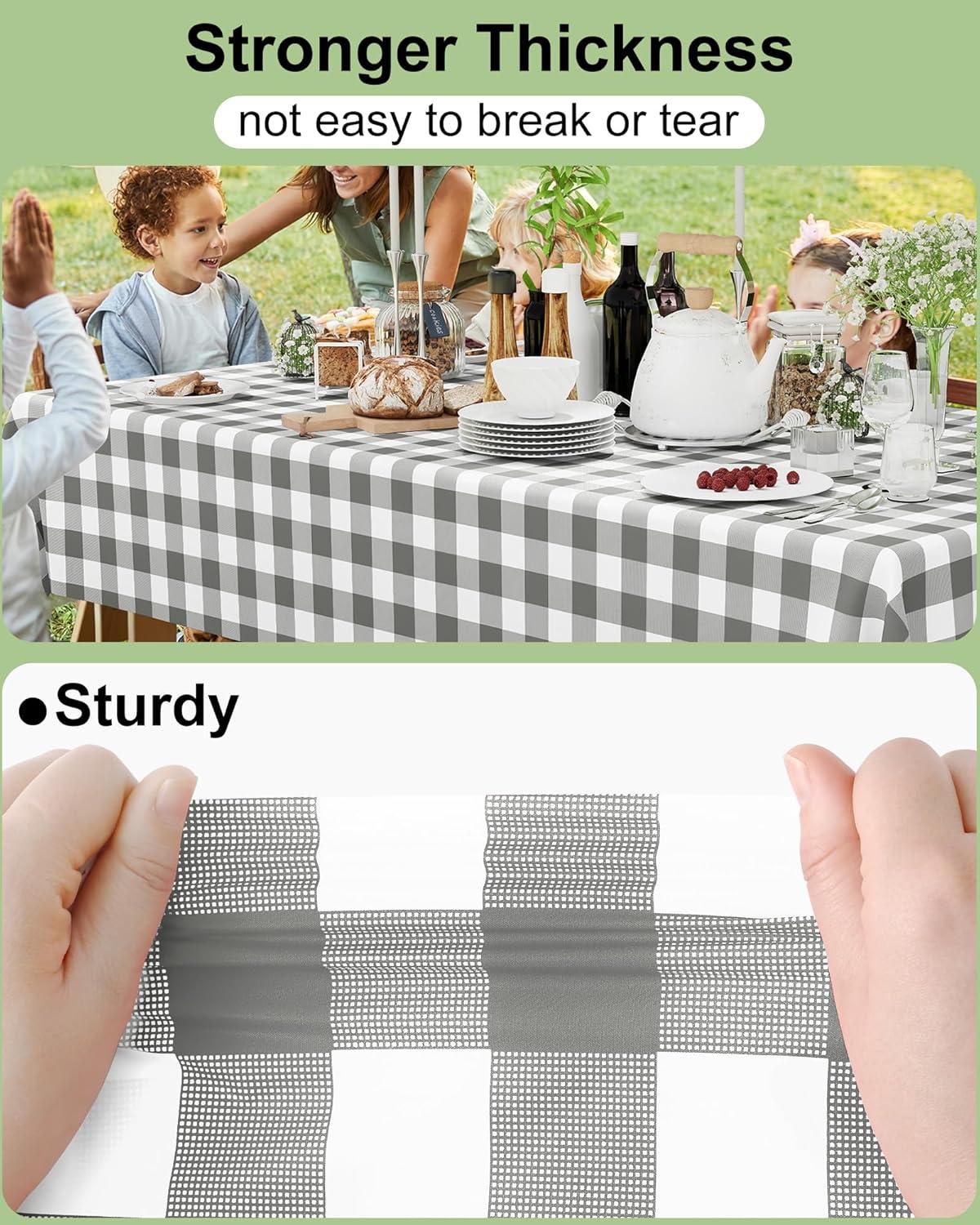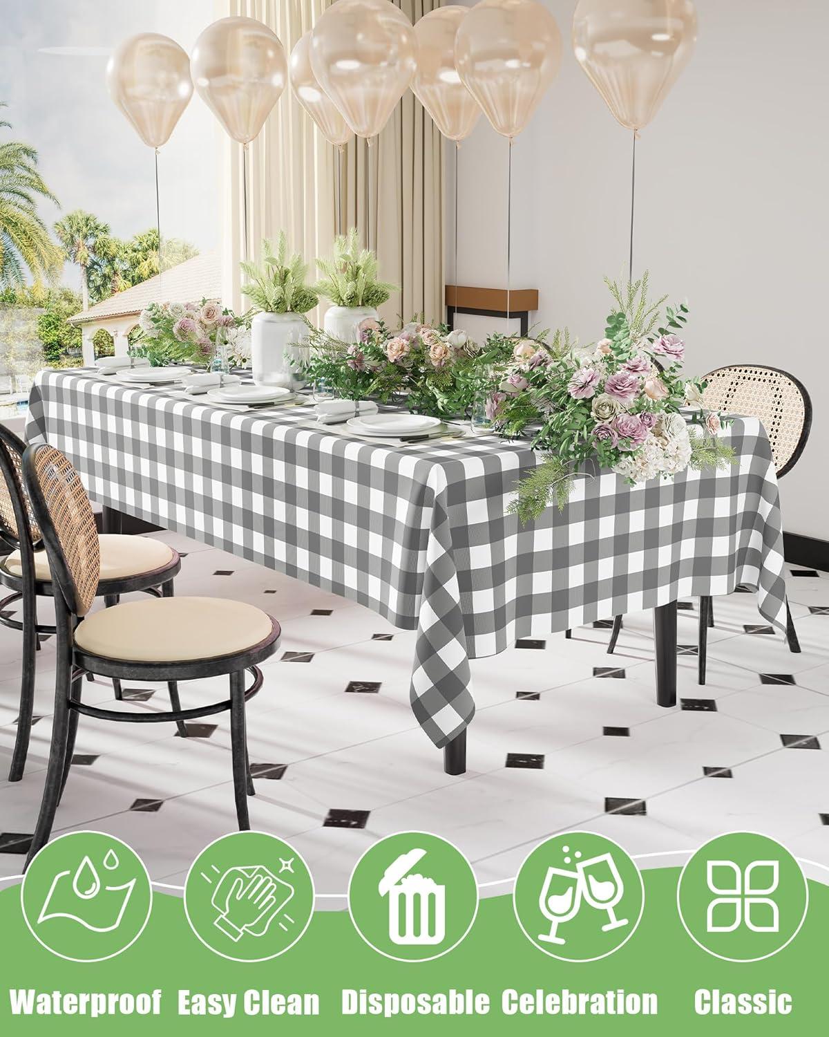 [Waterproof & Easy Clean] The surface of our plastic table cloth is waterproof, providing protection for your table from spills and stains. Simply wipe the tablecloth with a damp cloth to easily clean. After use, just dispose of it, and you're done!