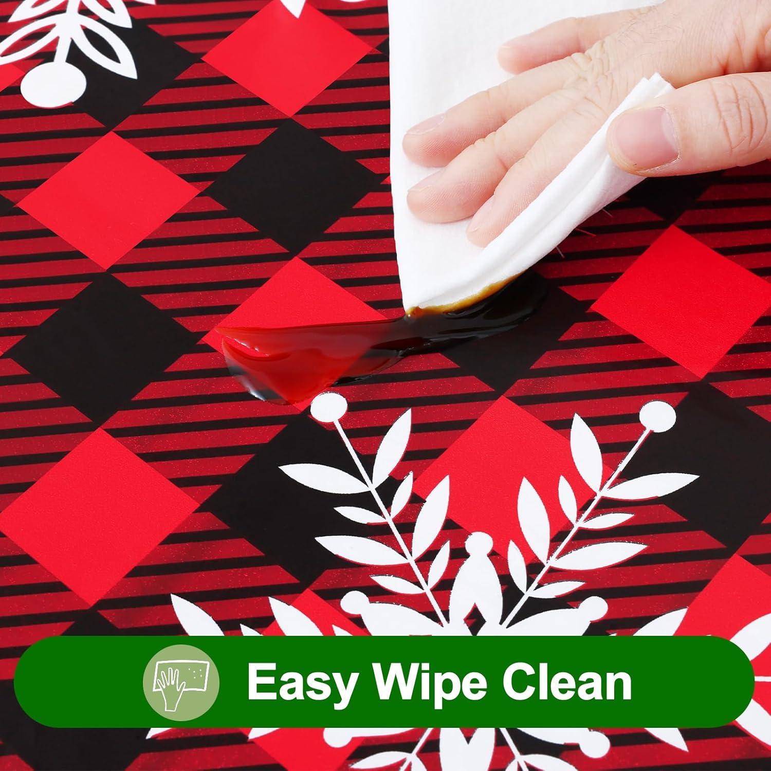 [Waterproof and Wipe Clean] The waterproof vinyl surfaces insulate our table cloths from water, milk, oil and other stains. Just rub with a damp cloth or sponge to remove the stain and look fresh.
