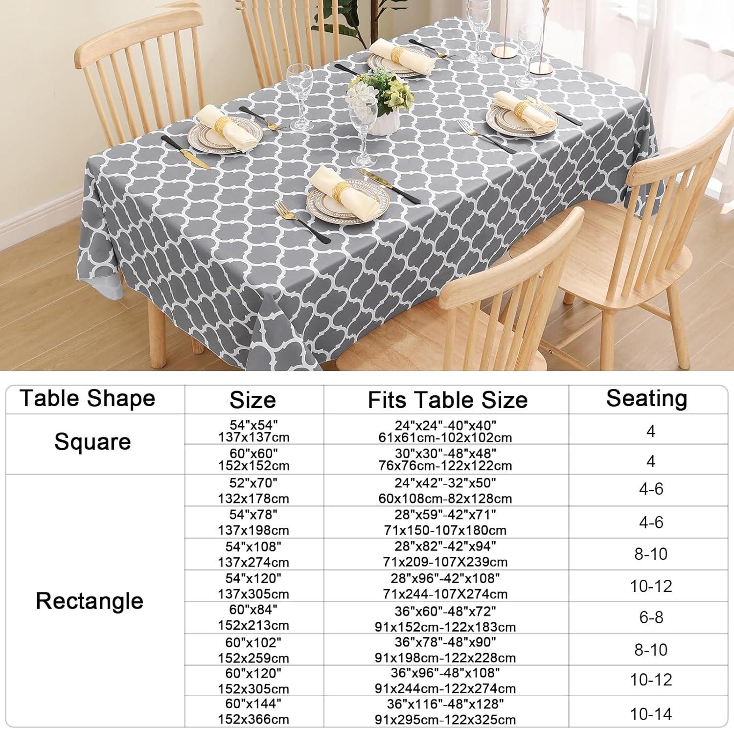 [Know Your Table Sizes] Smiry rectangle tablecloth measures 60 by 84 inches and fits rectangular tables measuring 36 x 60 inches to 48 x 72 inches, seating up to 6 to 8 adults. To purchase a more appropriate table cover, take a few seconds to measure your table before purchasing.