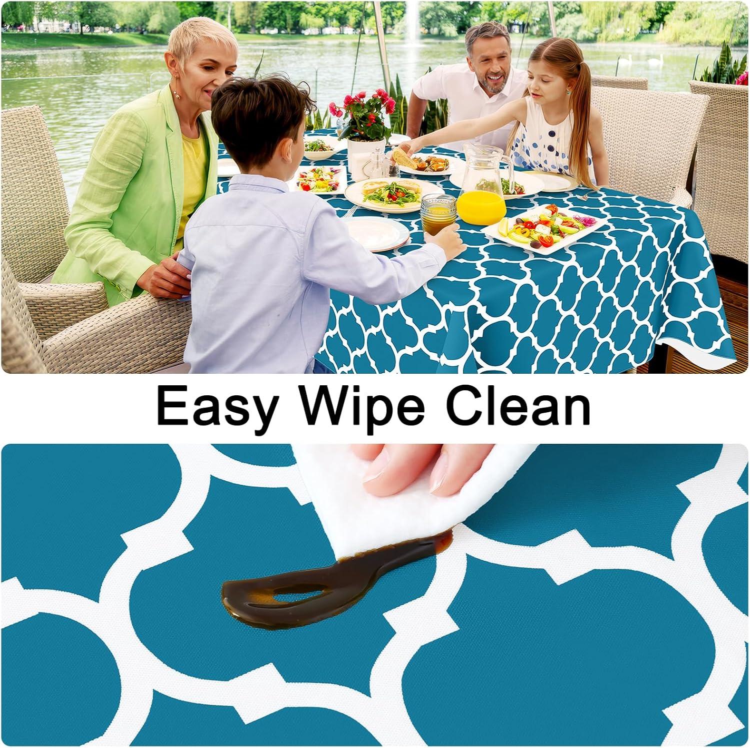 [Waterproof and Wipe Clean] The waterproof vinyl surfaces insulate our table cloths from water, milk, oil and other stains. Just rub with a damp cloth or sponge to remove the stain and look fresh.