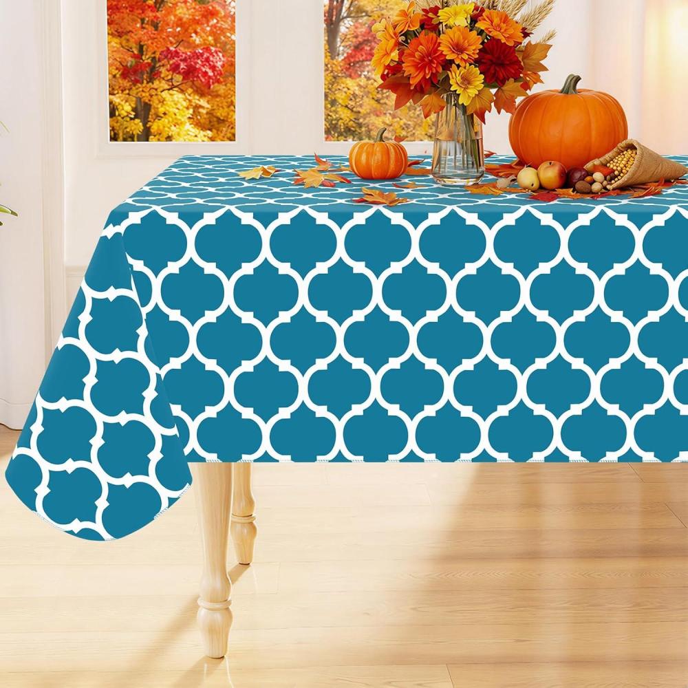 Smiry Fall Rectangle Table Cloth, Waterproof Vinyl Tablecloth with Flannel Backing, Wipeable Autumn Pumpkin Plastic Tablecloths for Harvest and Thanksgiving Parties (60″x84″, Black & Orange)(Teal)