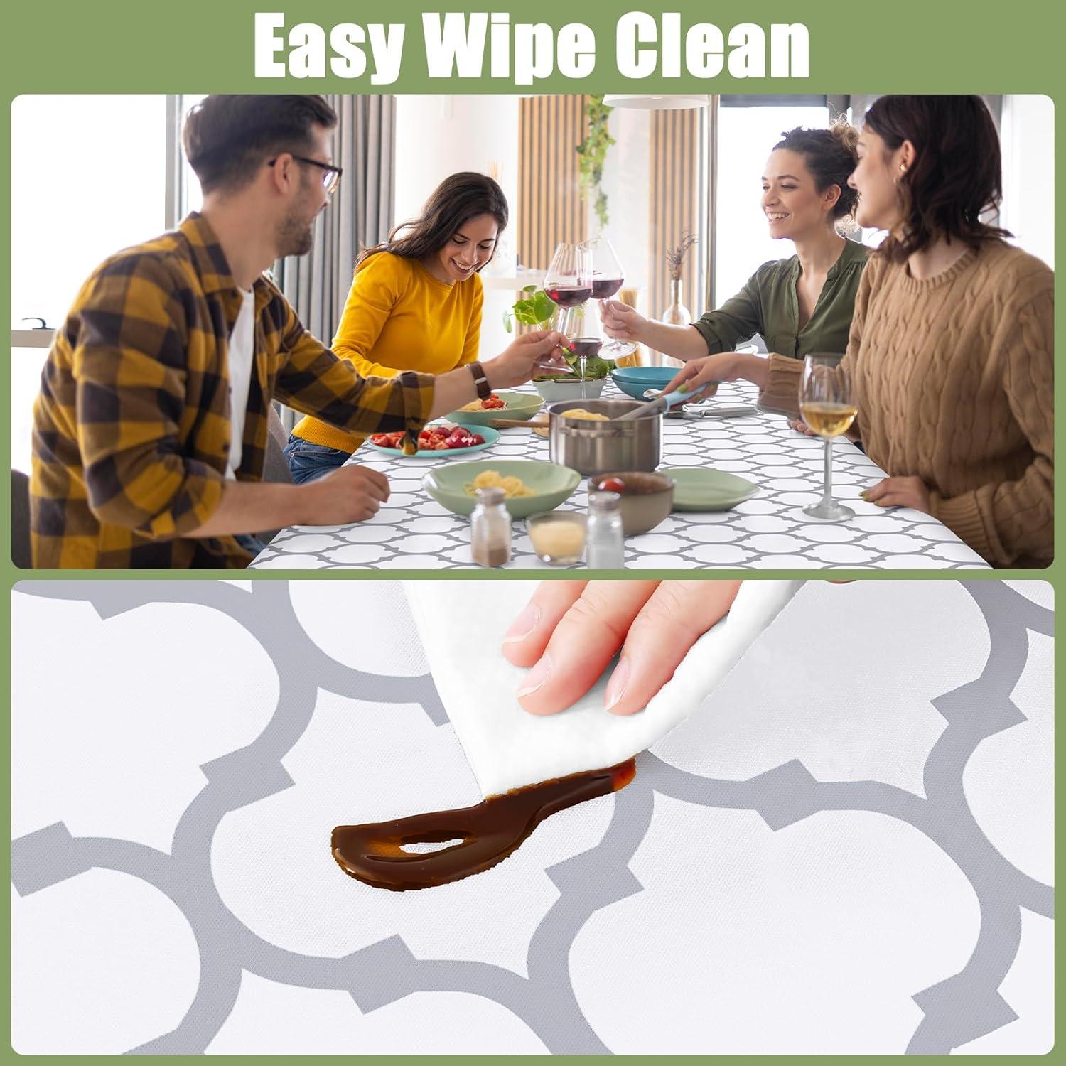 [Waterproof and Wipe Clean] The waterproof vinyl surfaces insulate our table cloths from water, milk, oil and other stains. Just rub with a damp cloth or sponge to remove the stain and look fresh.