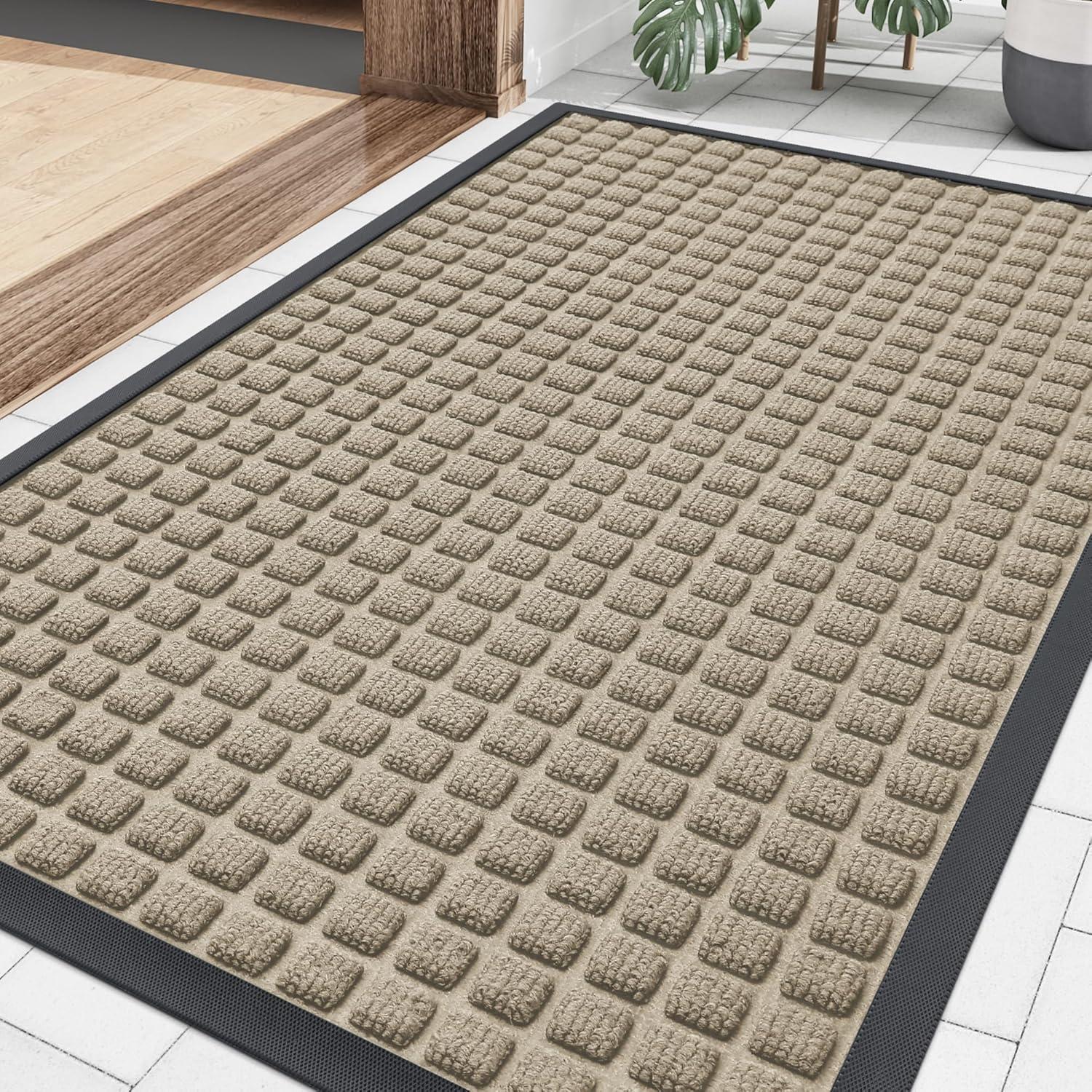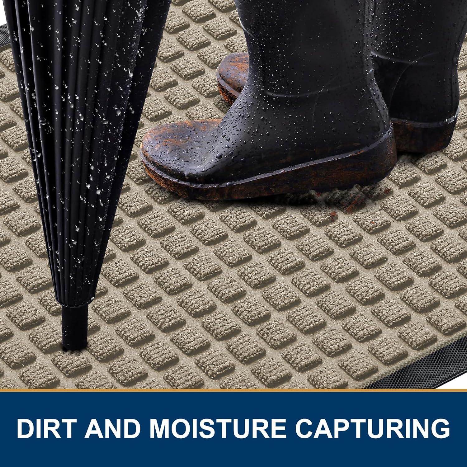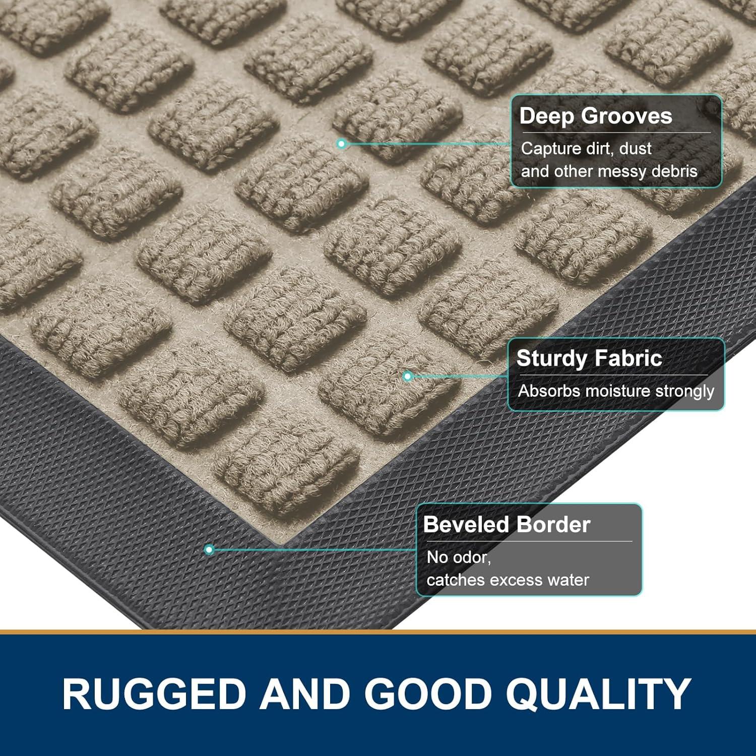 CAPTURES DIRT AND MOISTURE : Smiry doormat features a surface crafted from woven polyester fabric, designed to effectively capture dust, gravel, mud, sand, and other debris through its deep grooves. The sturdy beveled rubber edge will not accumulate water, ensuring your home remains dry and clean even in rainy, snowy, or muddy conditions