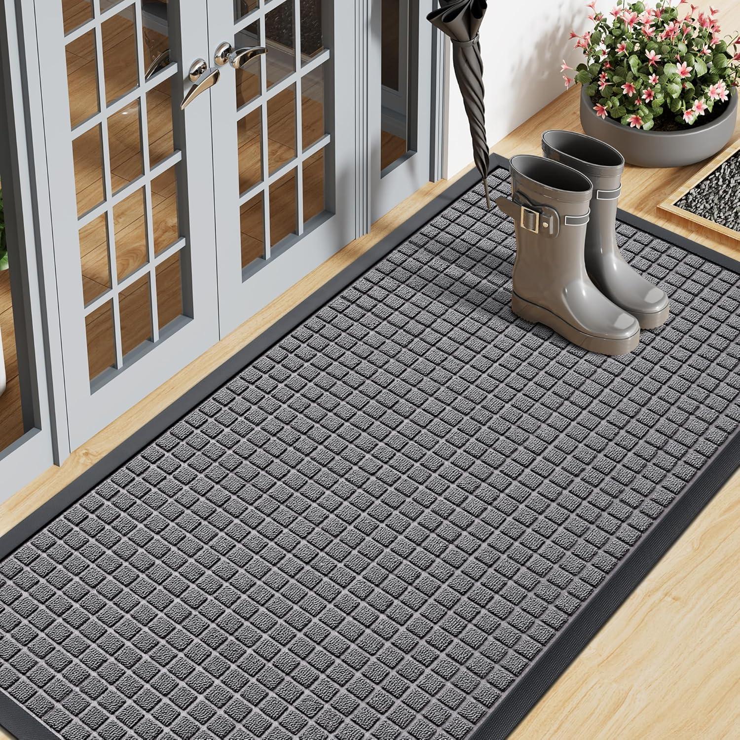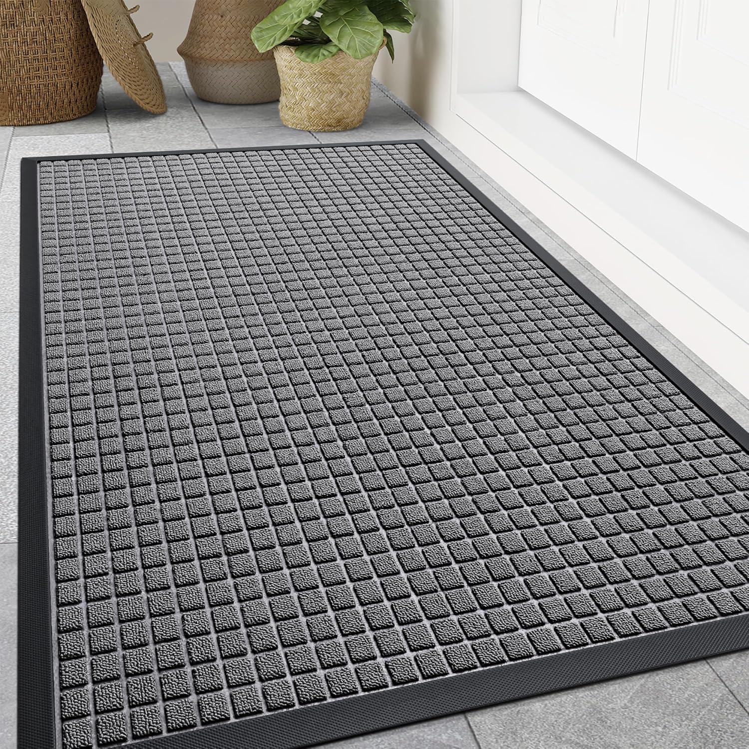 CAPTURES DIRT AND MOISTURE : Smiry doormat features a surface crafted from woven polyester fabric, designed to effectively capture dust, gravel, mud, sand, and other debris through its deep grooves. The sturdy beveled rubber edge will not accumulate water, ensuring your home remains dry and clean even in rainy, snowy, or muddy conditions