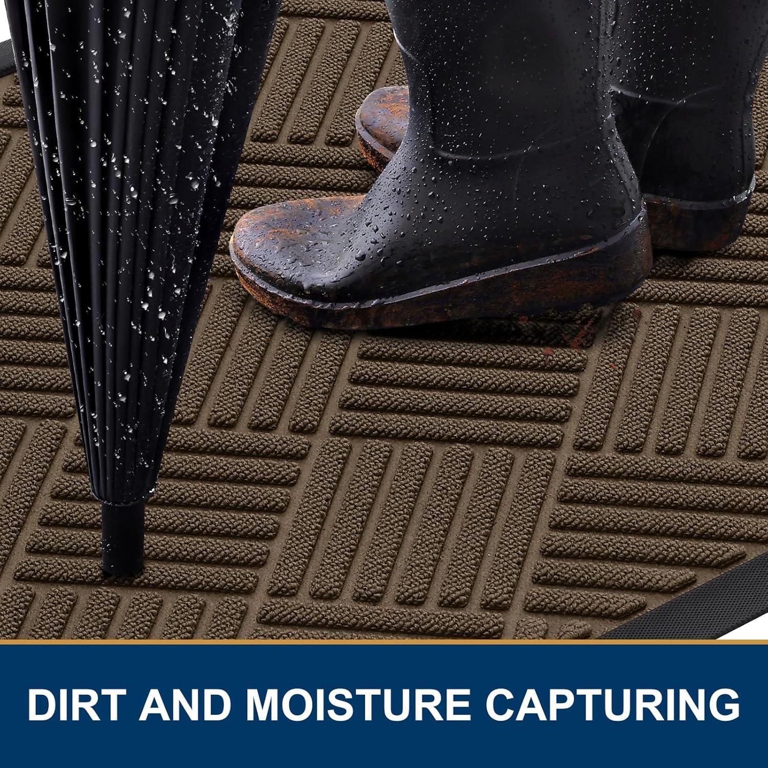 Capture Dirt and Moisture: The surface of the Smiry door mat is crafted from woven polyester fabric. The deep grooves can effectively trap the dust, gravel, mud, sand and other clutter. The sturdy beveled rubber edge will not accumulate water. Even rainy, snowy or muddy weather will keep your home dry and clean