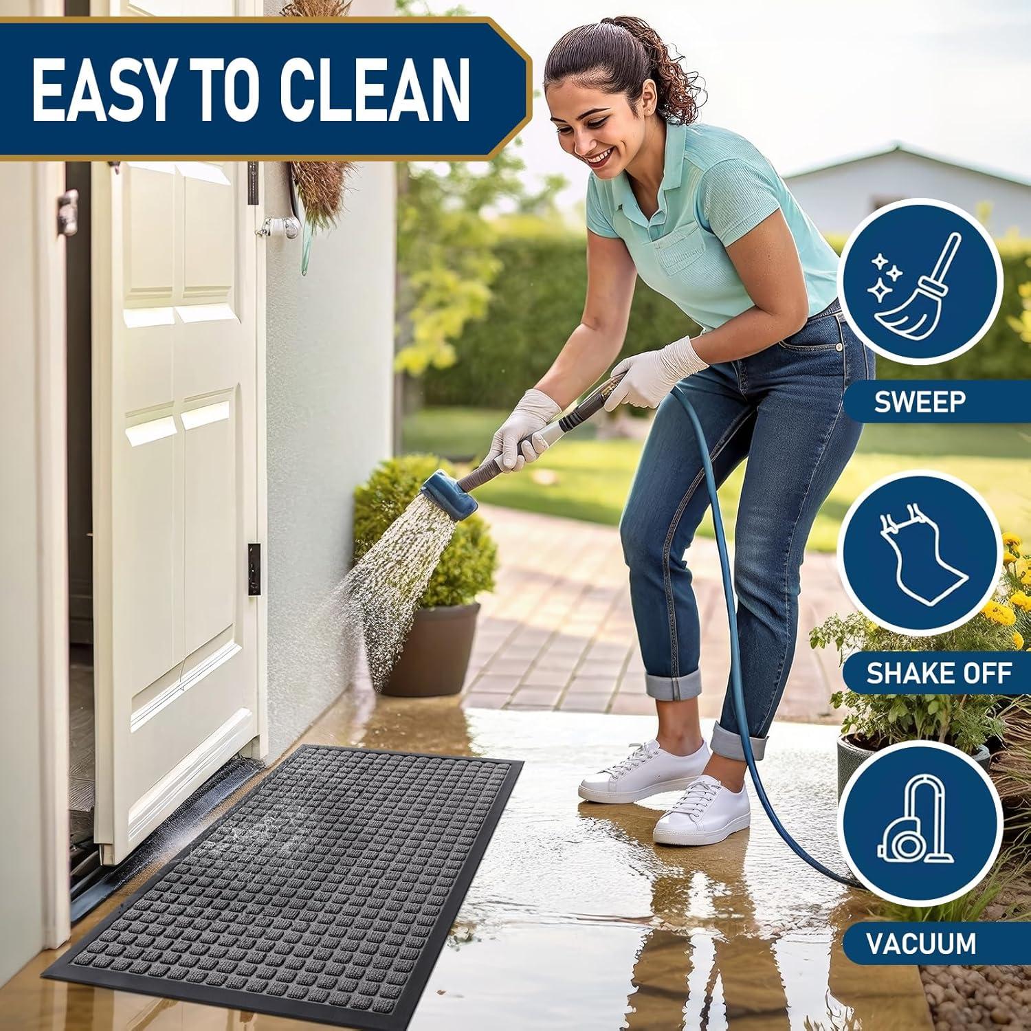 CAPTURES DIRT AND MOISTURE : Smiry doormat features a surface crafted from woven polyester fabric, designed to effectively capture dust, gravel, mud, sand, and other debris through its deep grooves. The sturdy beveled rubber edge will not accumulate water, ensuring your home remains dry and clean even in rainy, snowy, or muddy conditions