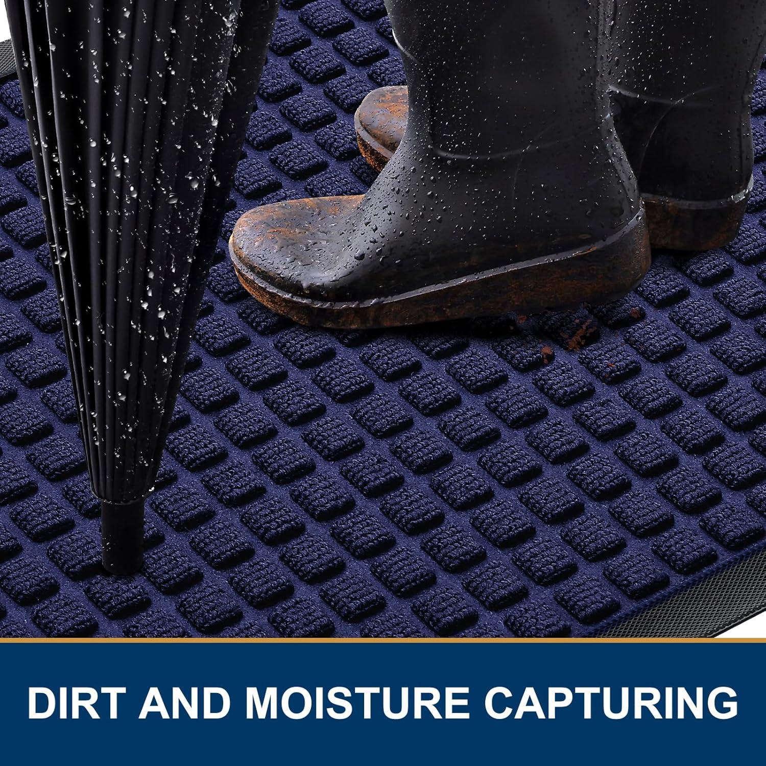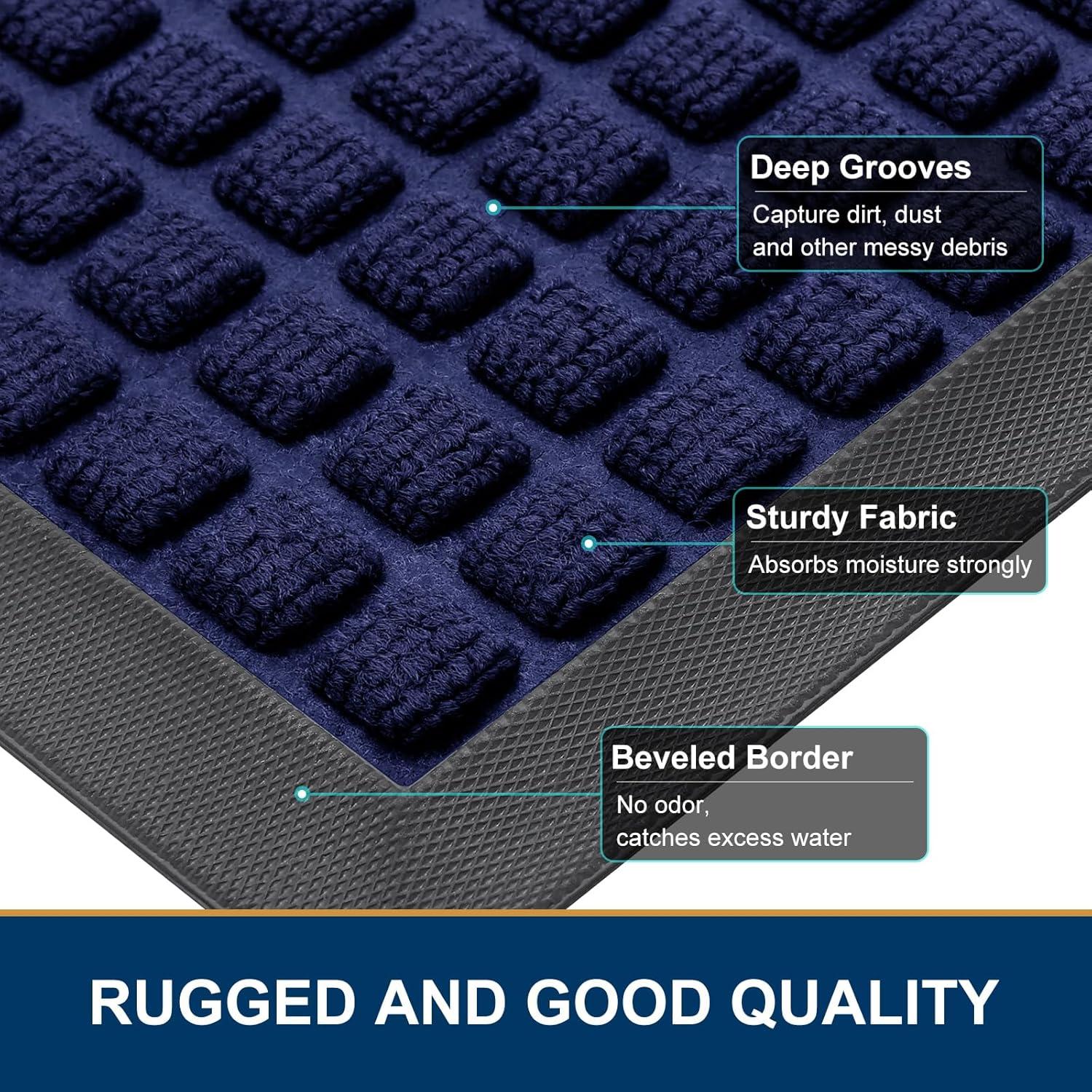 CAPTURES DIRT AND MOISTURE : Smiry doormat features a surface crafted from woven polyester fabric, designed to effectively capture dust, gravel, mud, sand, and other debris through its deep grooves. The sturdy beveled rubber edge will not accumulate water, ensuring your home remains dry and clean even in rainy, snowy, or muddy conditions