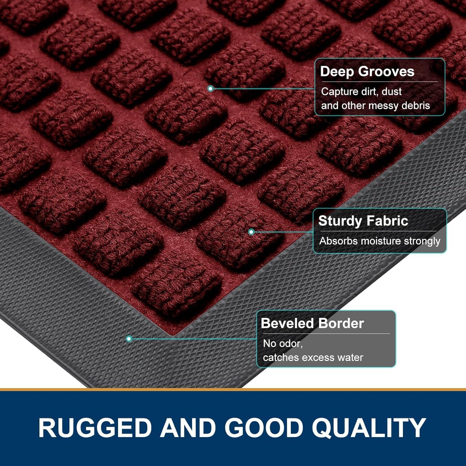 CAPTURES DIRT AND MOISTURE : Smiry doormat features a surface crafted from woven polyester fabric, designed to effectively capture dust, gravel, mud, sand, and other debris through its deep grooves. The sturdy beveled rubber edge will not accumulate water, ensuring your home remains dry and clean even in rainy, snowy, or muddy conditions