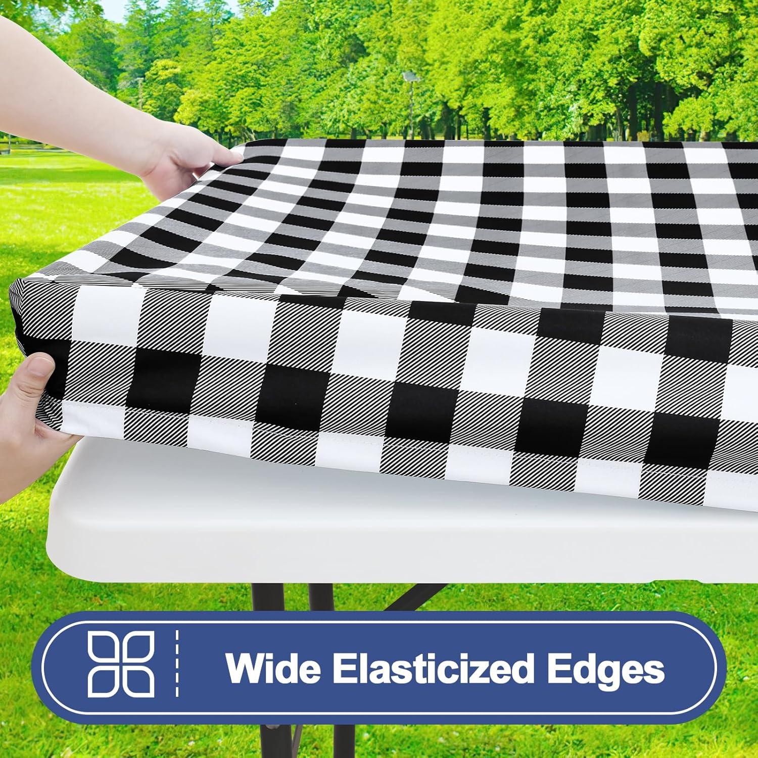 Smiry Picnic Table Cloth 2 Pack, Waterproof Elastic Fitted Tablecloths for 6FT Rectangle Tables, Washable Polyester Buffalo Plaid Tablecloth for Camping, Dining & Outdoor (Black & White, 30" x 72")(Black and White)