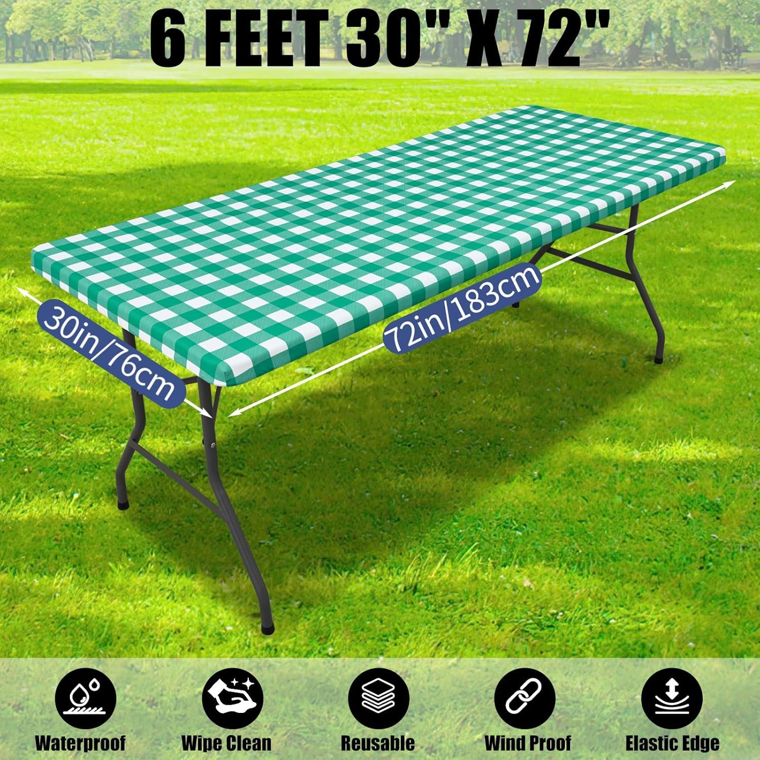 Smiry Picnic Table Cloth 2 Pack, Waterproof Elastic Fitted Tablecloths for 6FT Rectangle Tables, Washable Polyester Buffalo Plaid Tablecloth for Camping, Dining & Outdoor (Black & White, 30" x 72")(Green and White)