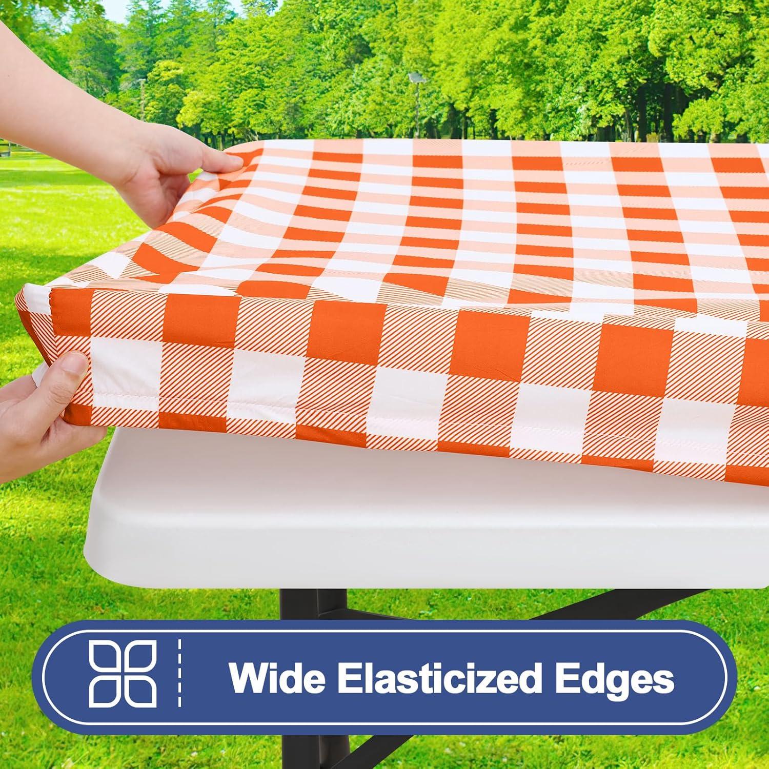 Smiry Picnic Table Cloth 2 Pack, Waterproof Elastic Fitted Tablecloths for 6FT Rectangle Tables, Washable Polyester Buffalo Plaid Tablecloth for Camping, Dining & Outdoor (Black & White, 30″ x 72″)(Orange and White)