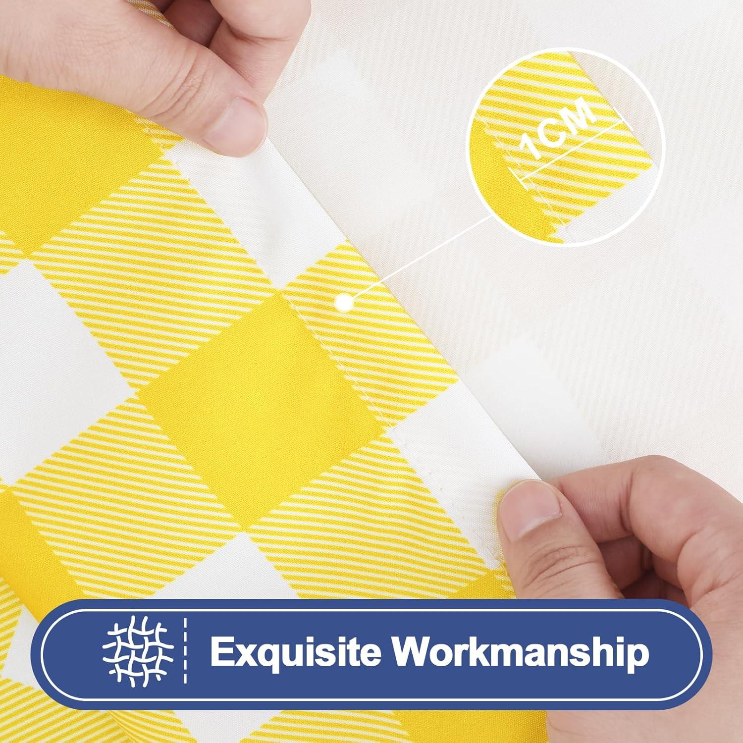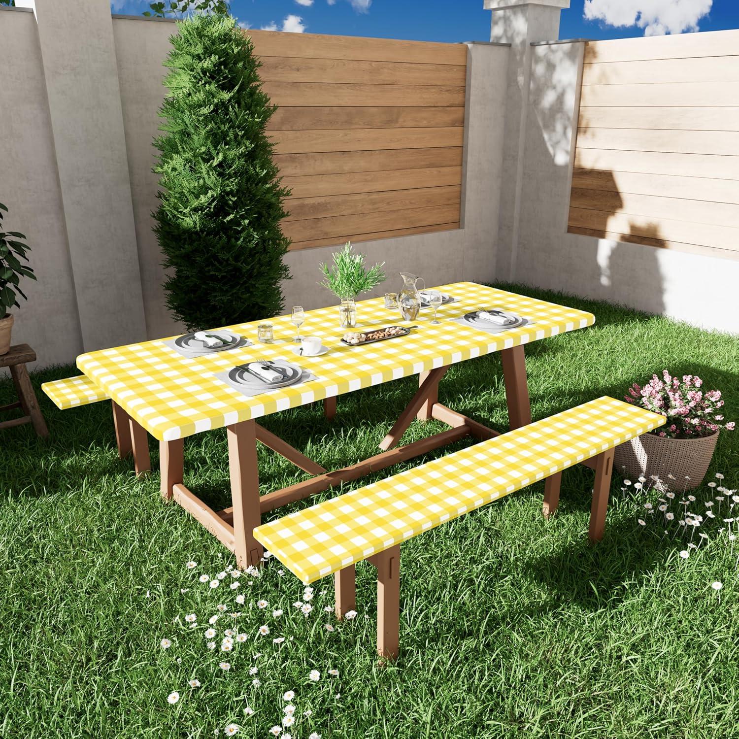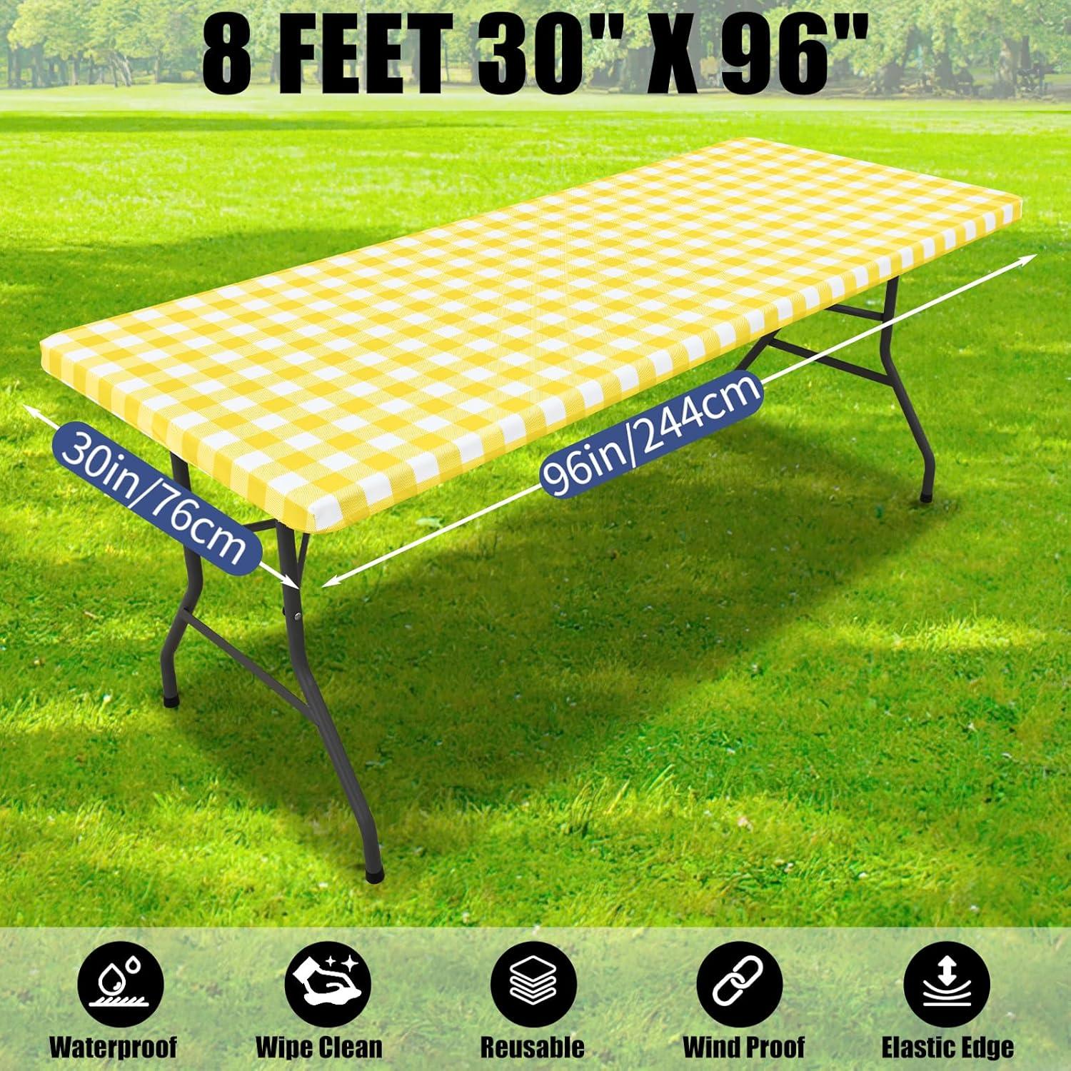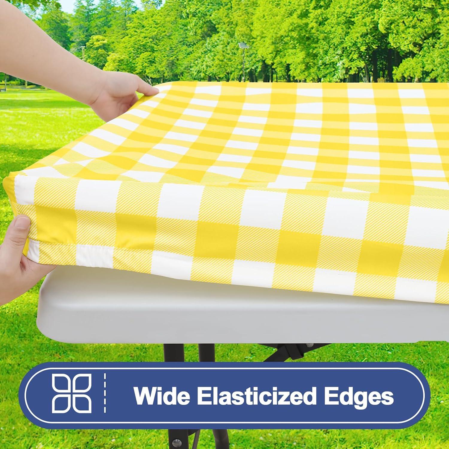 Smiry Picnic Table Cloth 2 Pack, Waterproof Elastic Fitted Tablecloths for 6FT Rectangle Tables, Washable Polyester Buffalo Plaid Tablecloth for Camping, Dining & Outdoor (Black & White, 30″ x 72″)(Yellow and White)