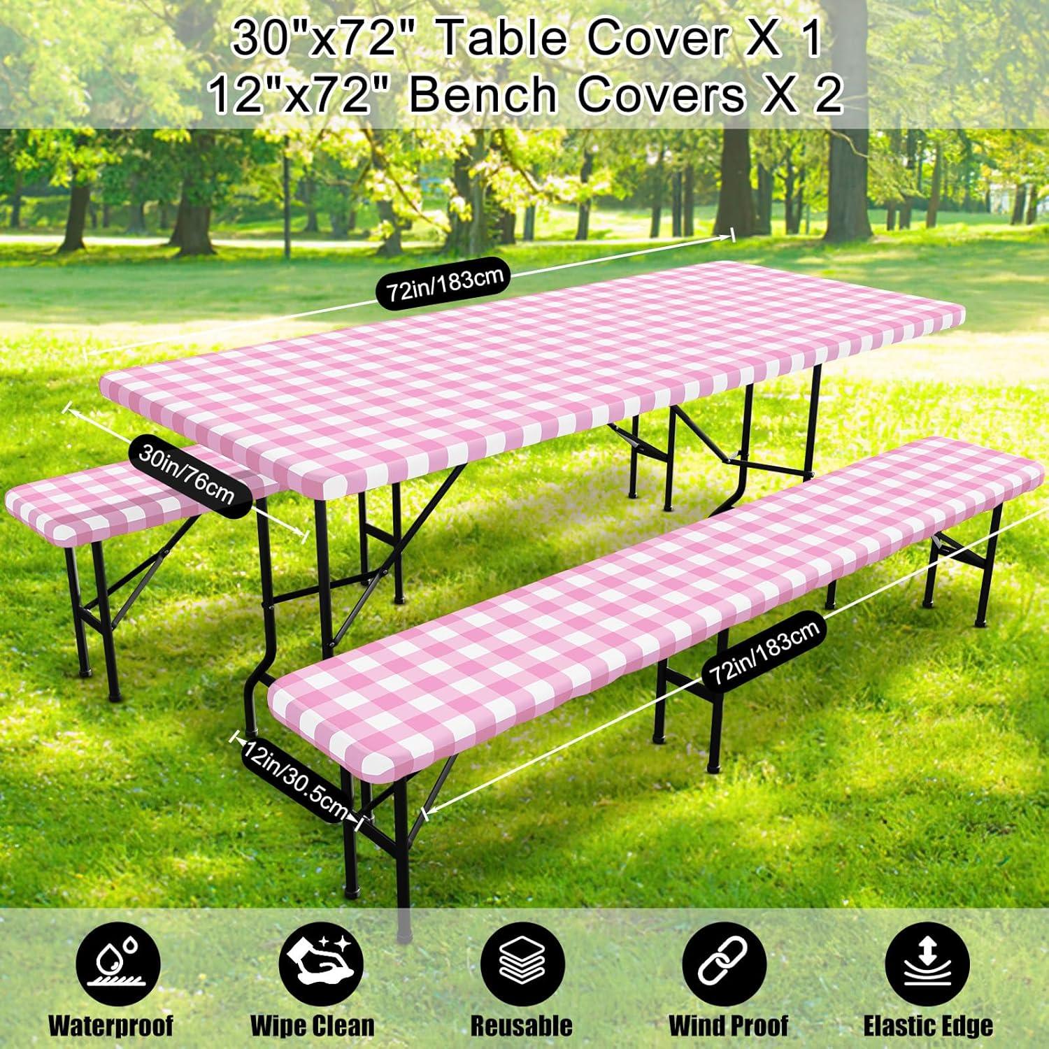 Smiry Picnic Table Cover with Bench Covers, Waterproof Elastic Fitted Tablecloths for 6 Foot Rectangle Tables, Washable Buffalo Plaid Tablecloth for Camping, Outdoor (Black & White, 30"x72")(Pink and White)