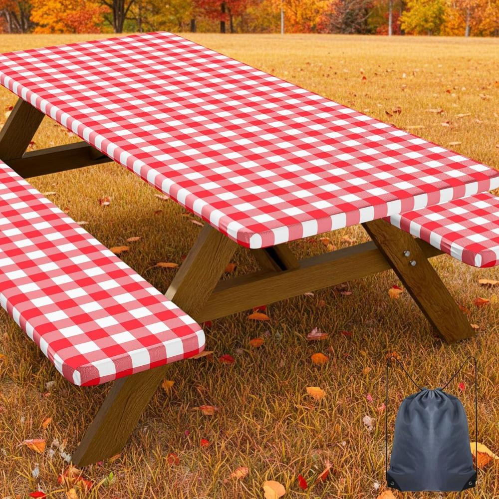 Smiry Picnic Table Cover with Bench Covers, Waterproof Elastic Fitted Tablecloths for 6 Foot Rectangle Tables, Washable Buffalo Plaid Tablecloth for Camping, Outdoor (Black & White, 30"x72")(Red and White)