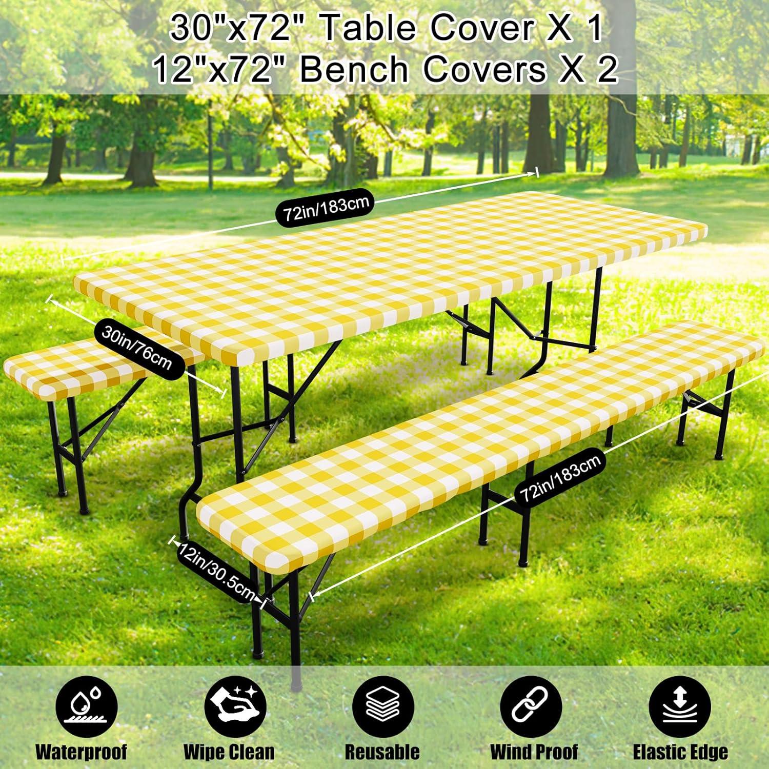 Smiry Picnic Table Cover with Bench Covers, Waterproof Elastic Fitted Tablecloths for 6 Foot Rectangle Tables, Washable Buffalo Plaid Tablecloth for Camping, Outdoor (Black & White, 30"x72")(Yellow and White)