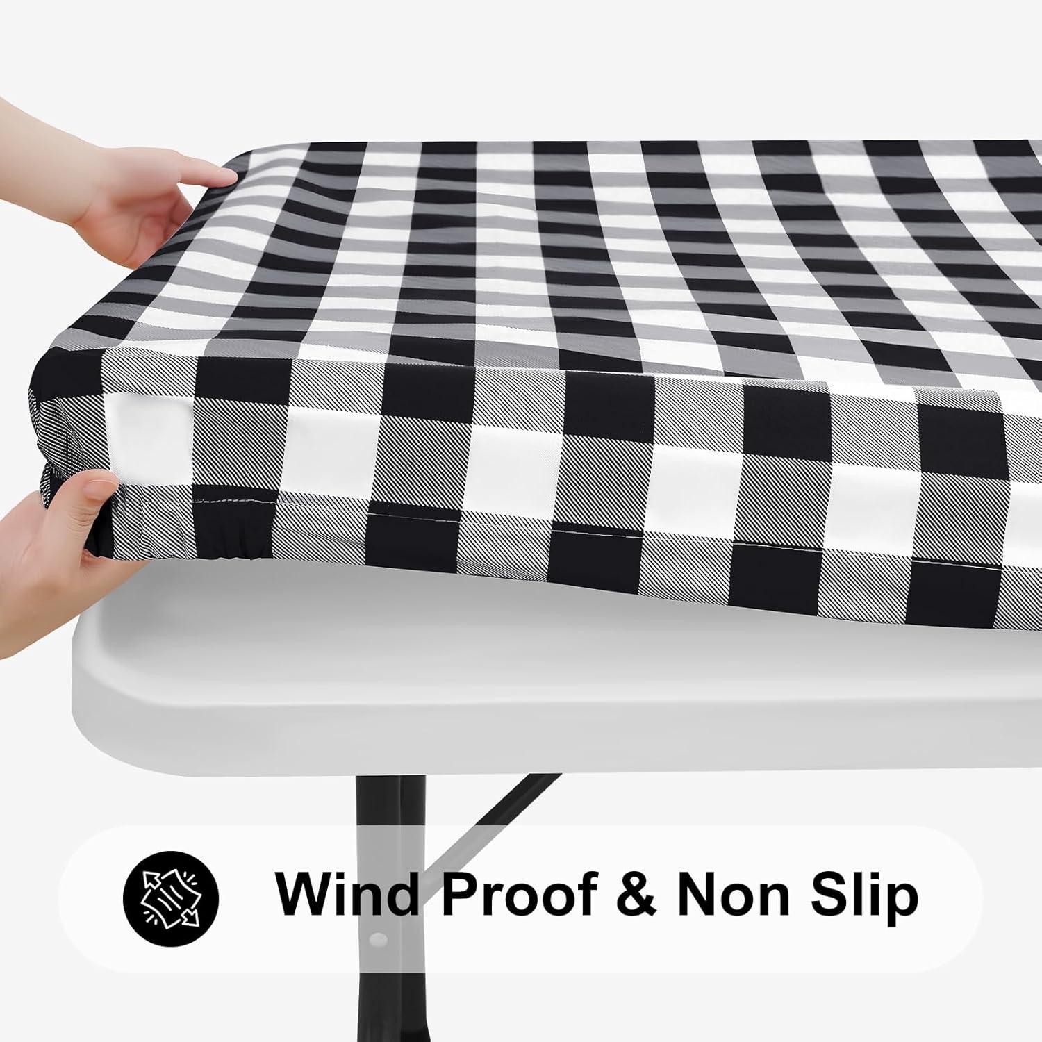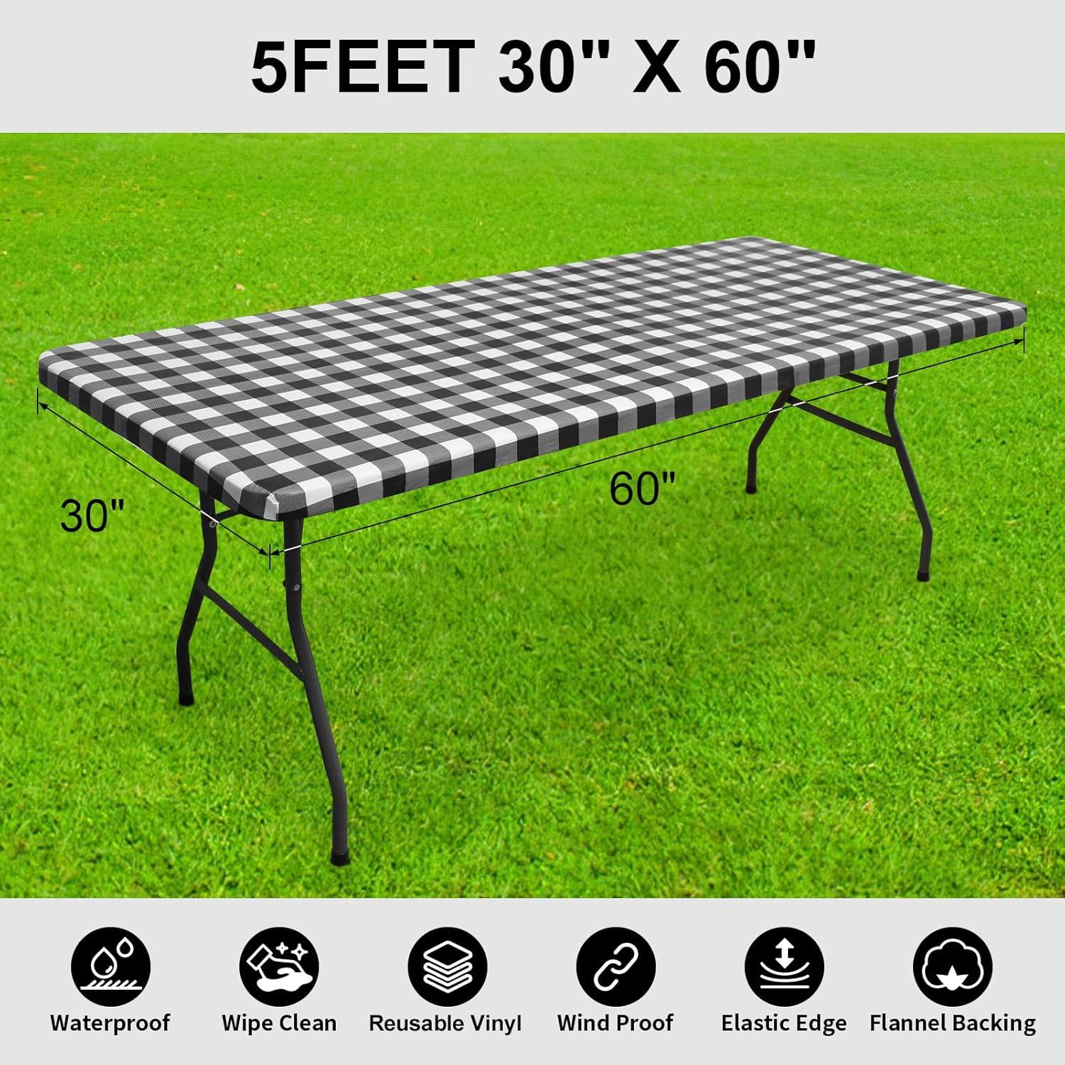 Smiry Rectangle Picnic Table Cloth, Elastic Waterproof Fitted Vinyl Tablecloths, Flannel Backed Buffalo Plaid Table Covers for Dining, Camping, Outdoor (Black and White, 30" x 72")(Black and White)