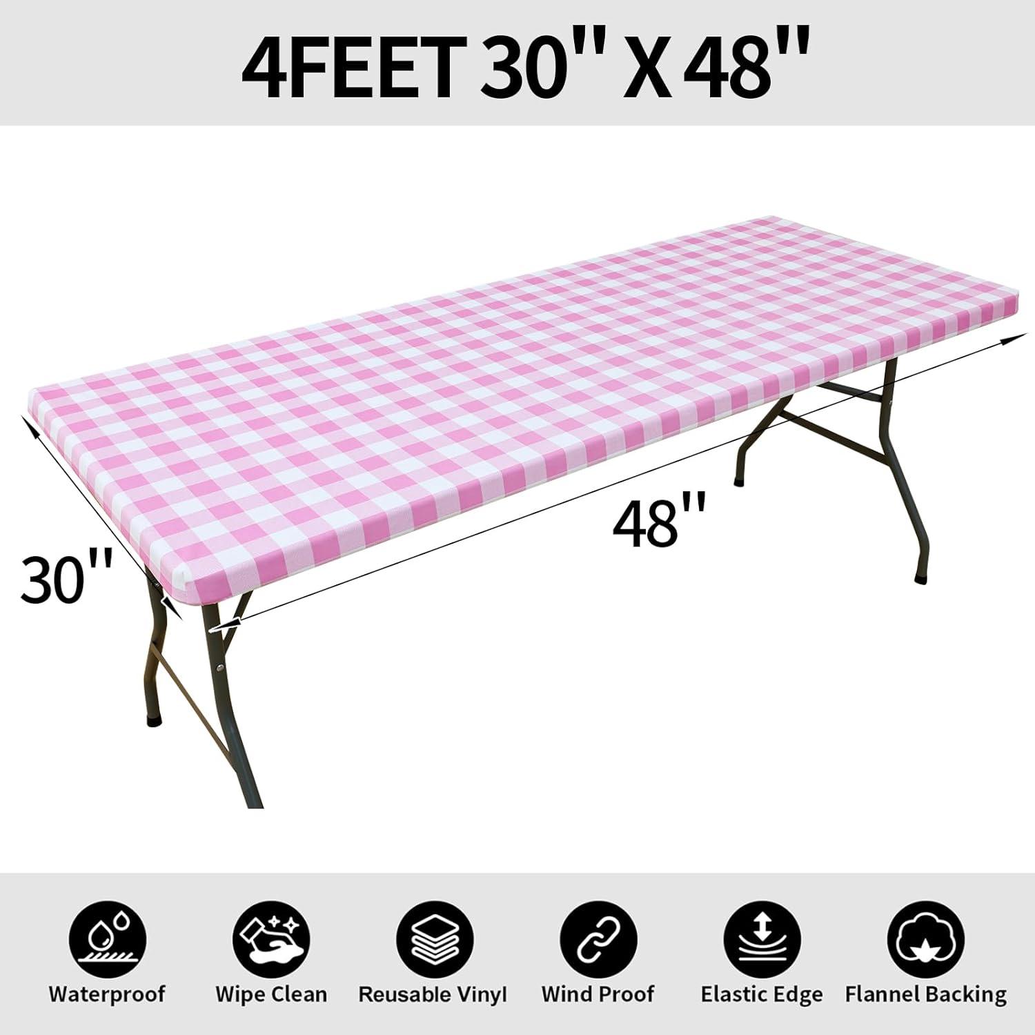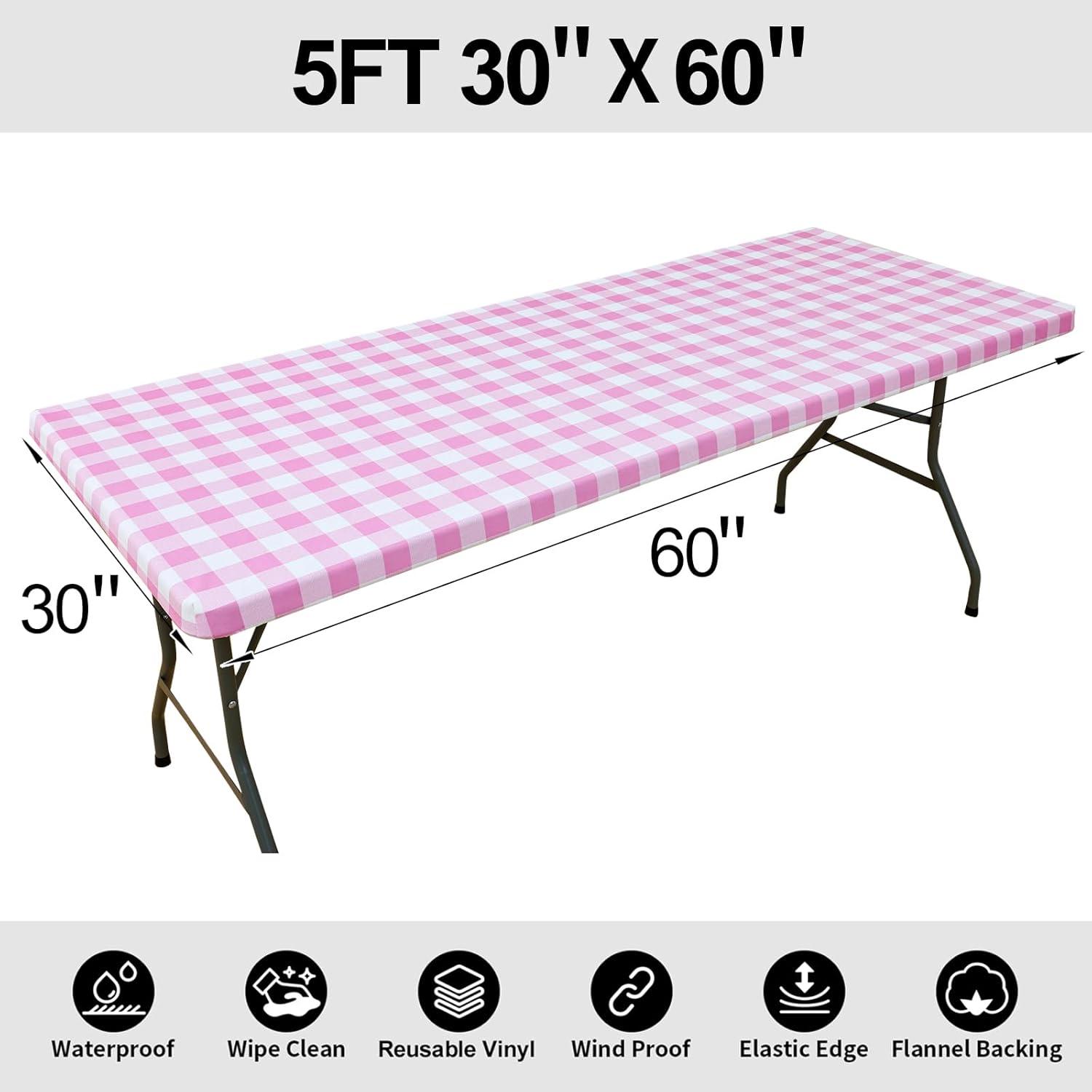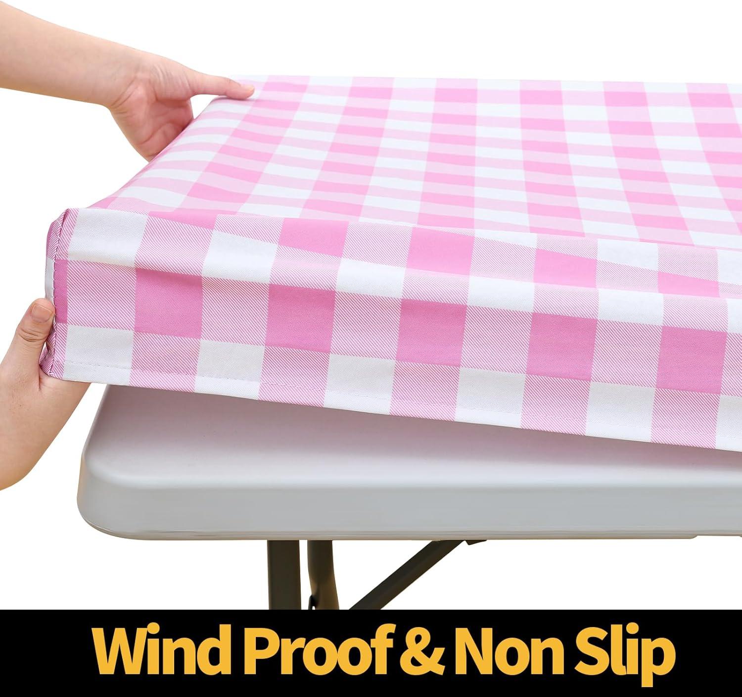 Smiry Rectangle Picnic Table Cloth, Elastic Waterproof Fitted Vinyl Tablecloths, Flannel Backed Buffalo Plaid Table Covers for Dining, Camping, Outdoor (Black and White, 30" x 72")(Pink and White)