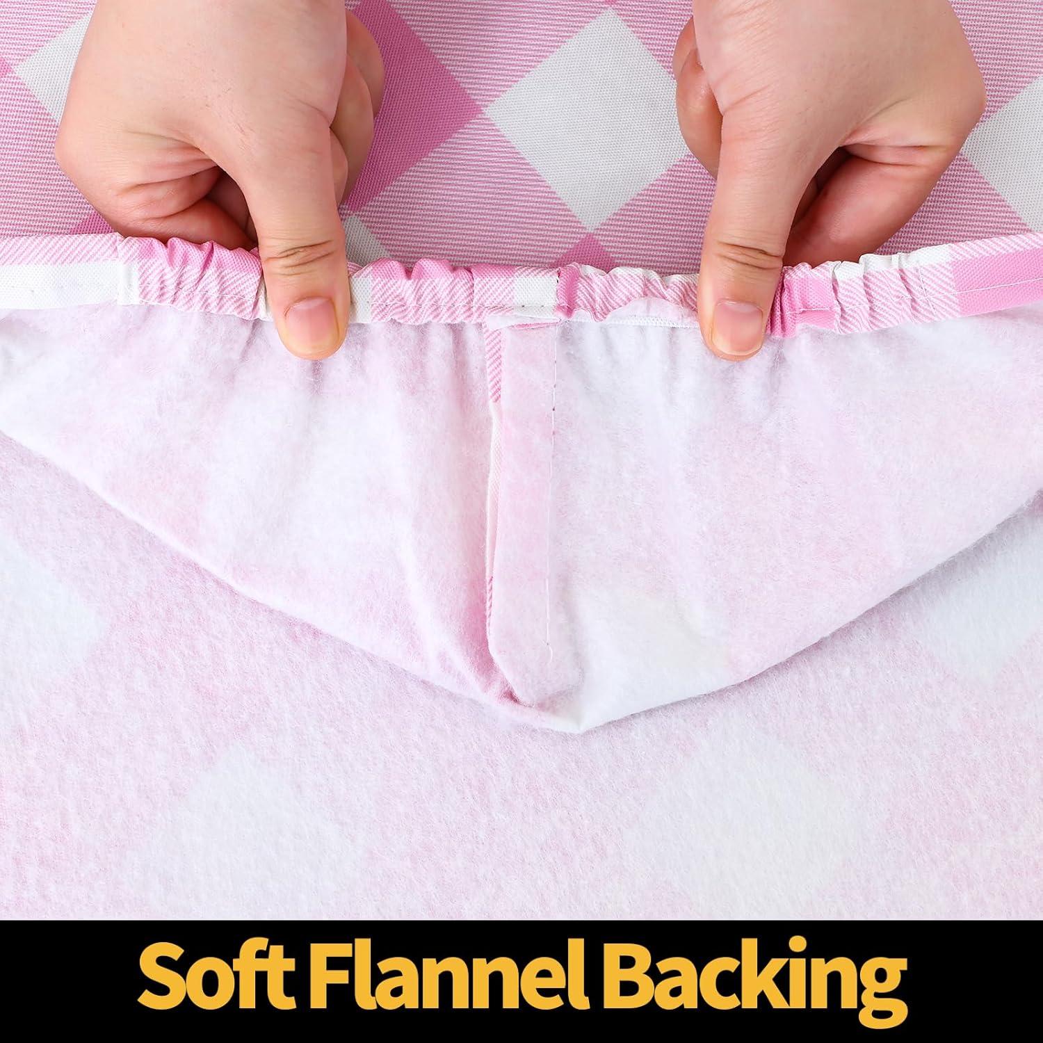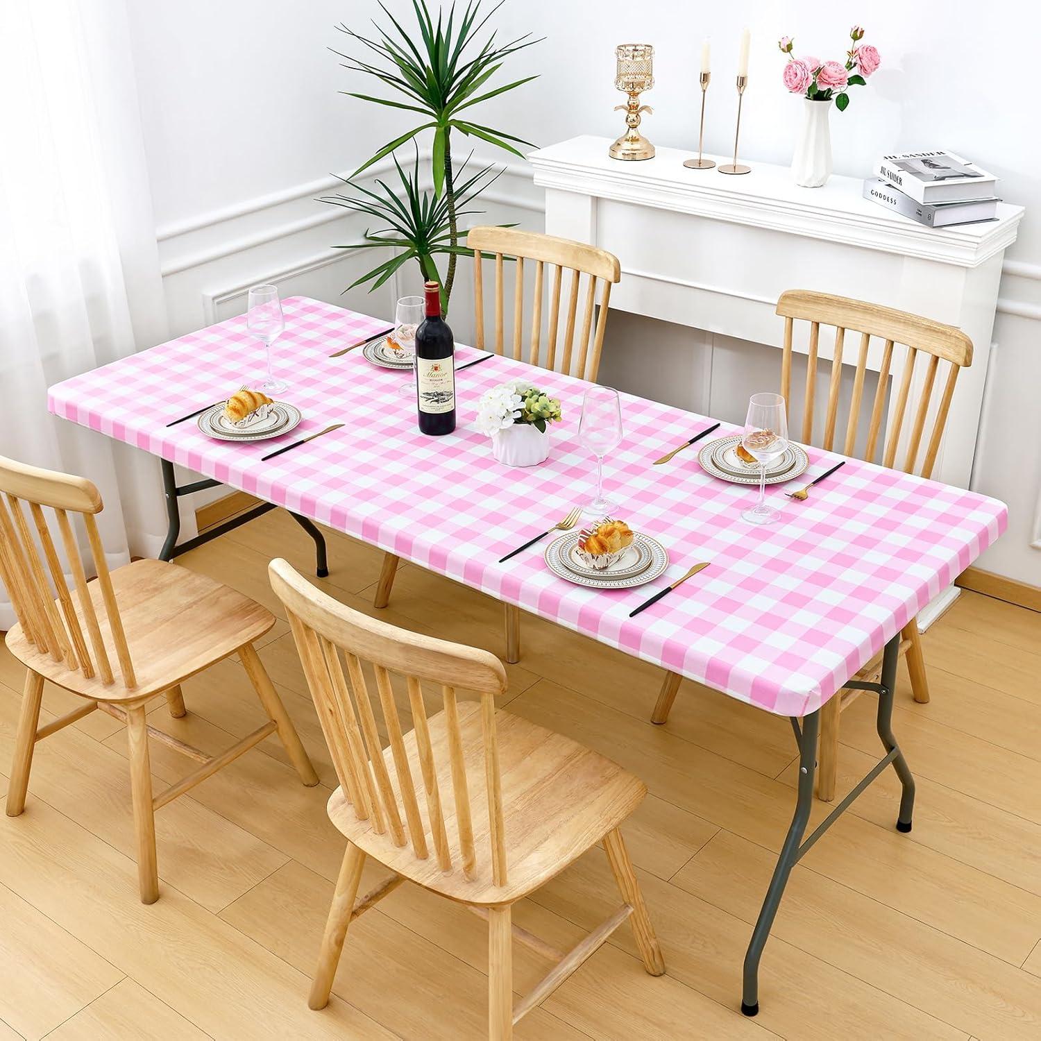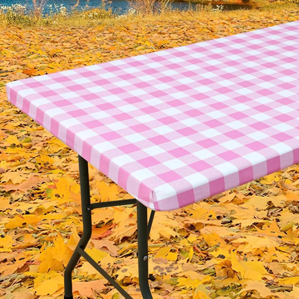 Smiry Rectangle Picnic Table Cloth, Elastic Waterproof Fitted Vinyl Tablecloths, Flannel Backed Buffalo Plaid Table Covers for Dining, Camping, Outdoor (Black and White, 30" x 72")(Pink and White)