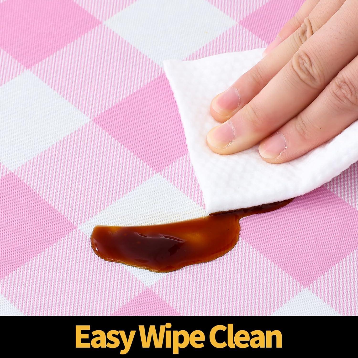 [Waterproof & Wipe Clean] Our table covers with waterproof vinyl surface, will not let the oil, milk and other liquid penetration on to the tables. And this table cover is very easy to clean and take care of, just wipe it gently with a damp cloth, bringing