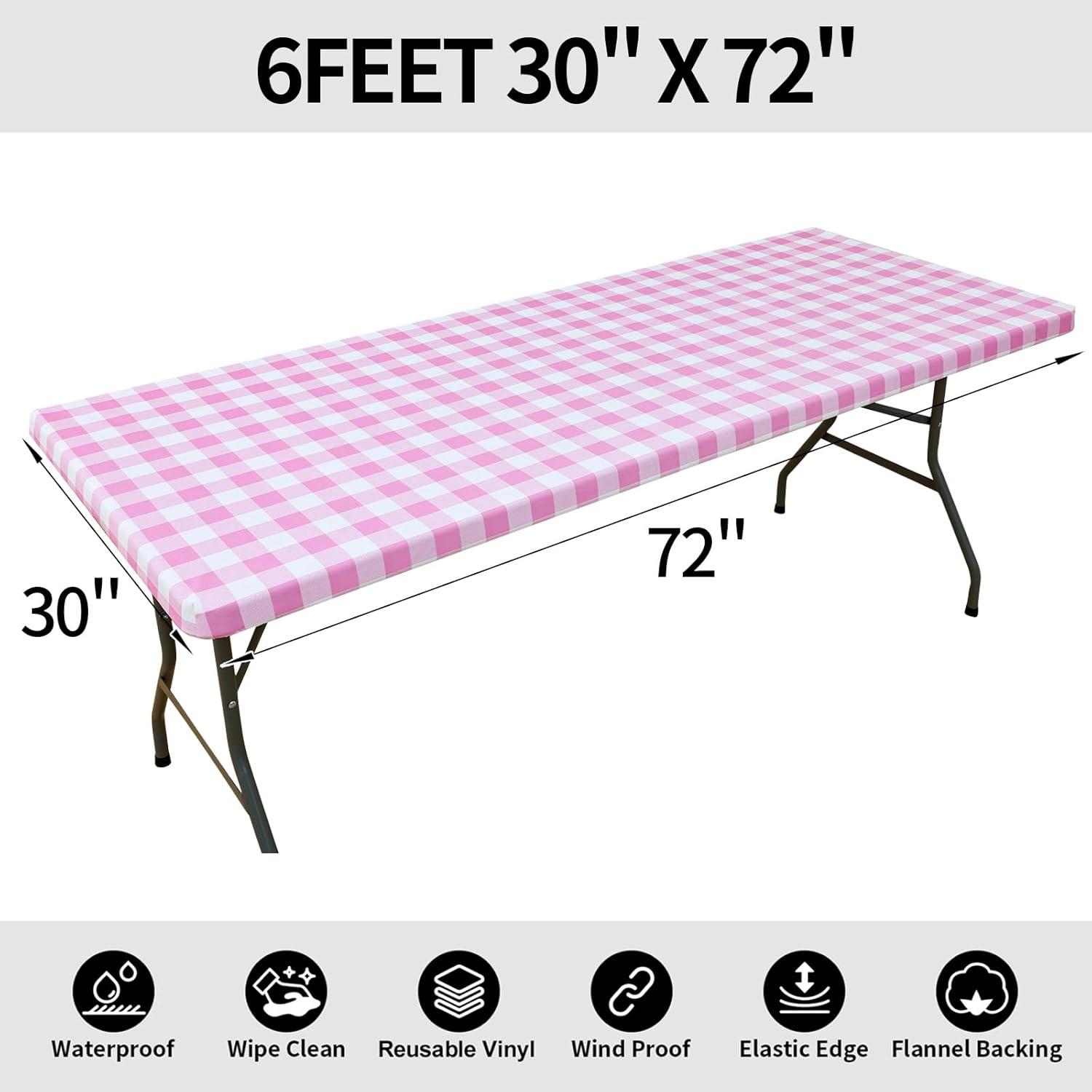 [Applicable Size] Our fitted tablecloth measures 30 inch x 72 inch and features 1.57 inches thickness to completely snug fit table top. The 6 foot tablecloth suitable for 4 or 6 seats oblong fold tables. Please note confirm the size of your table before purchase