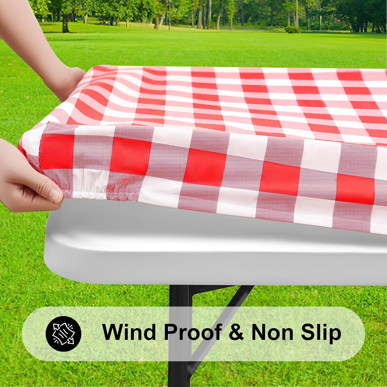 [Windproof & Non-Slip] Our table cloth designed with strong elastic edges design that holds it securely to the table even when it's windy outside. The fitted tablecloth won't slip and stays in place when people move and pull, to provide you with comfortable meal times experience in parties, picnics, camping, indoor or outdoors