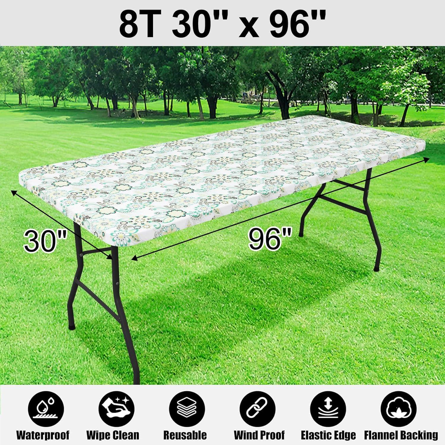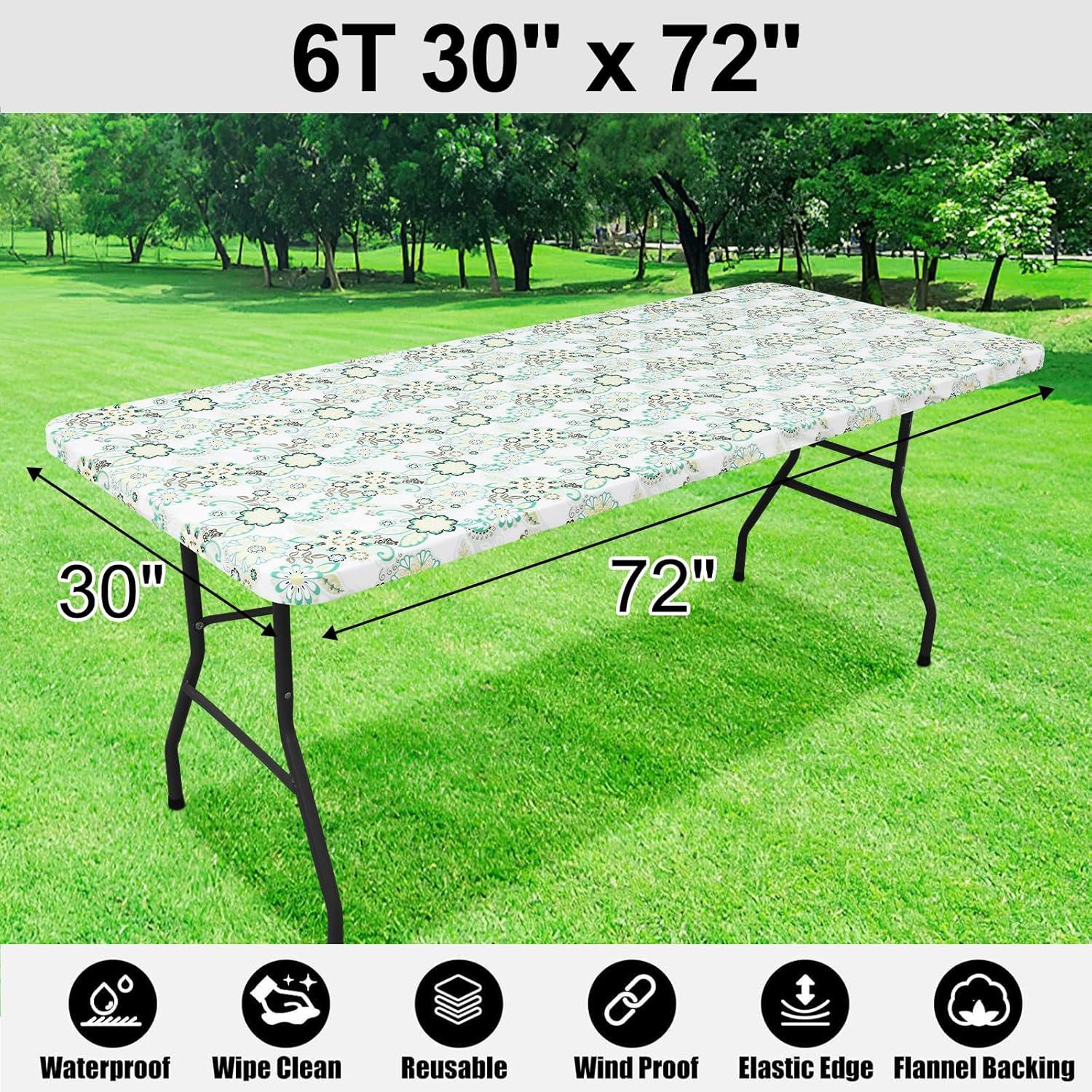Smiry Rectangle Picnic Table Cloth, Waterproof Elastic Fitted Outdoor Tablecloths for 6 Foot Tables, Wipeable Flannel Backed Vinyl Table Cover for Camping, Dining and Indoor (30″x72″, Grey)(Teal & White)