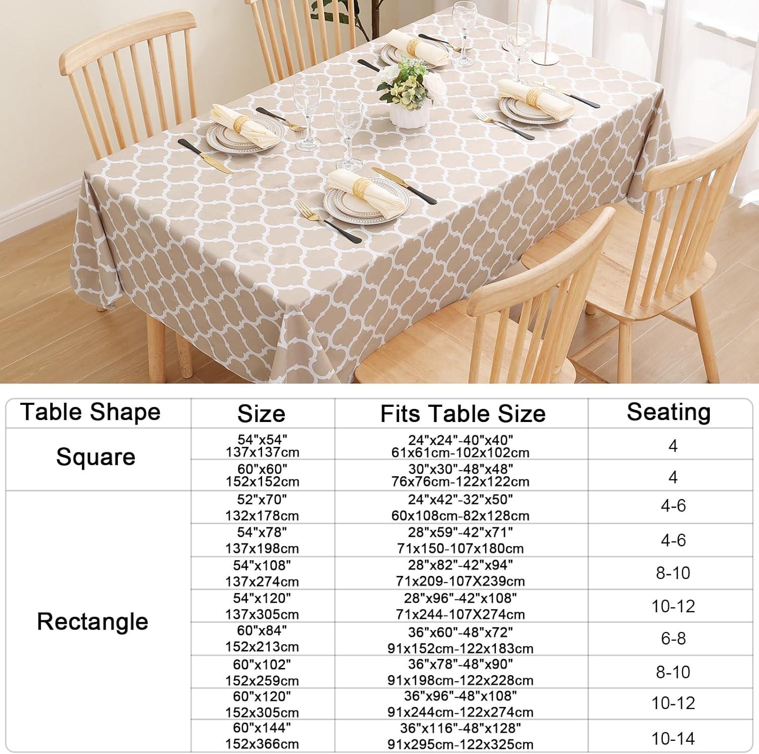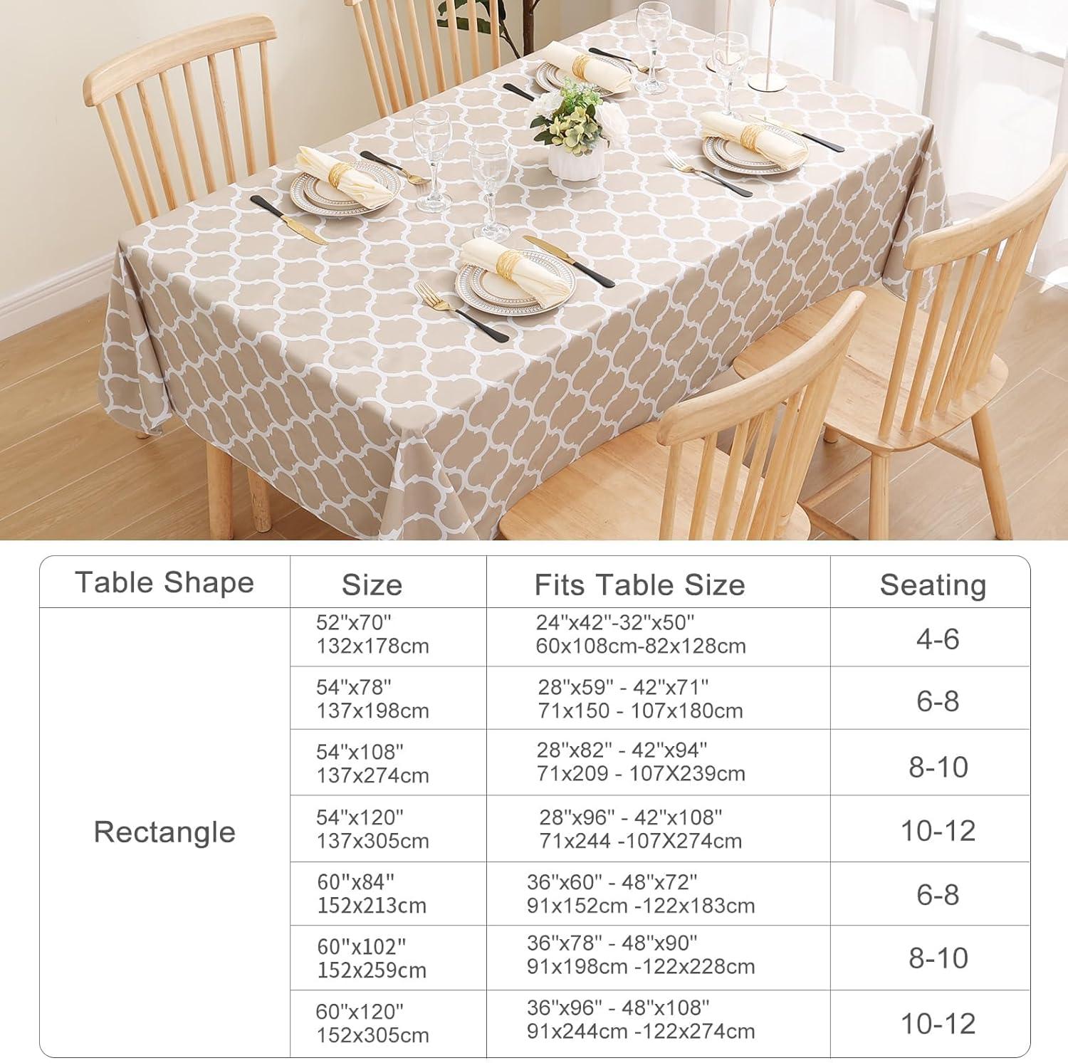 [Know Your Table Sizes] Smiry rectangle tablecloth measures 60 by 84 inches and fits rectangular tables measuring 36 x 60 inches to 48 x 72 inches, seating up to 6 to 8 adults. To purchase a more appropriate table cover, take a few seconds to measure your table before purchasing.