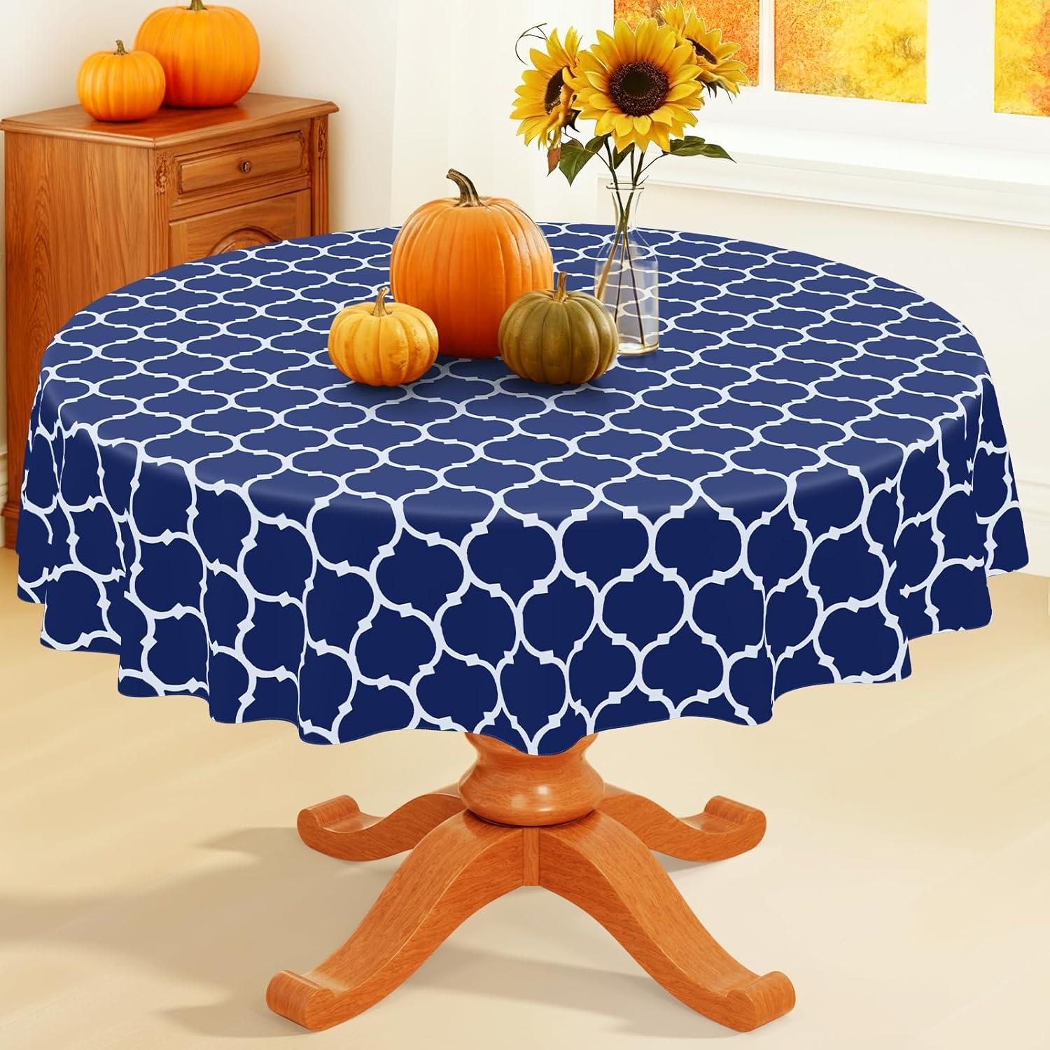 Smiry Round Plastic Table Cloth, Waterproof Vinyl Tablecloth with Flannel Backing for Round Tables, Wipeable Spillproof Tablecloths for Dining, Camping, Indoor and Outdoor (60″ Round, Black)(Navy Blue)