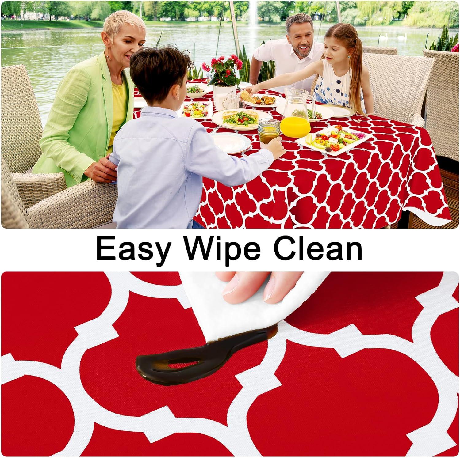[Waterproof and Wipe Clean] The waterproof vinyl surfaces insulate our table cloths from water, milk, oil and other stains. Just rub with a damp cloth or sponge to remove the stain and look fresh.