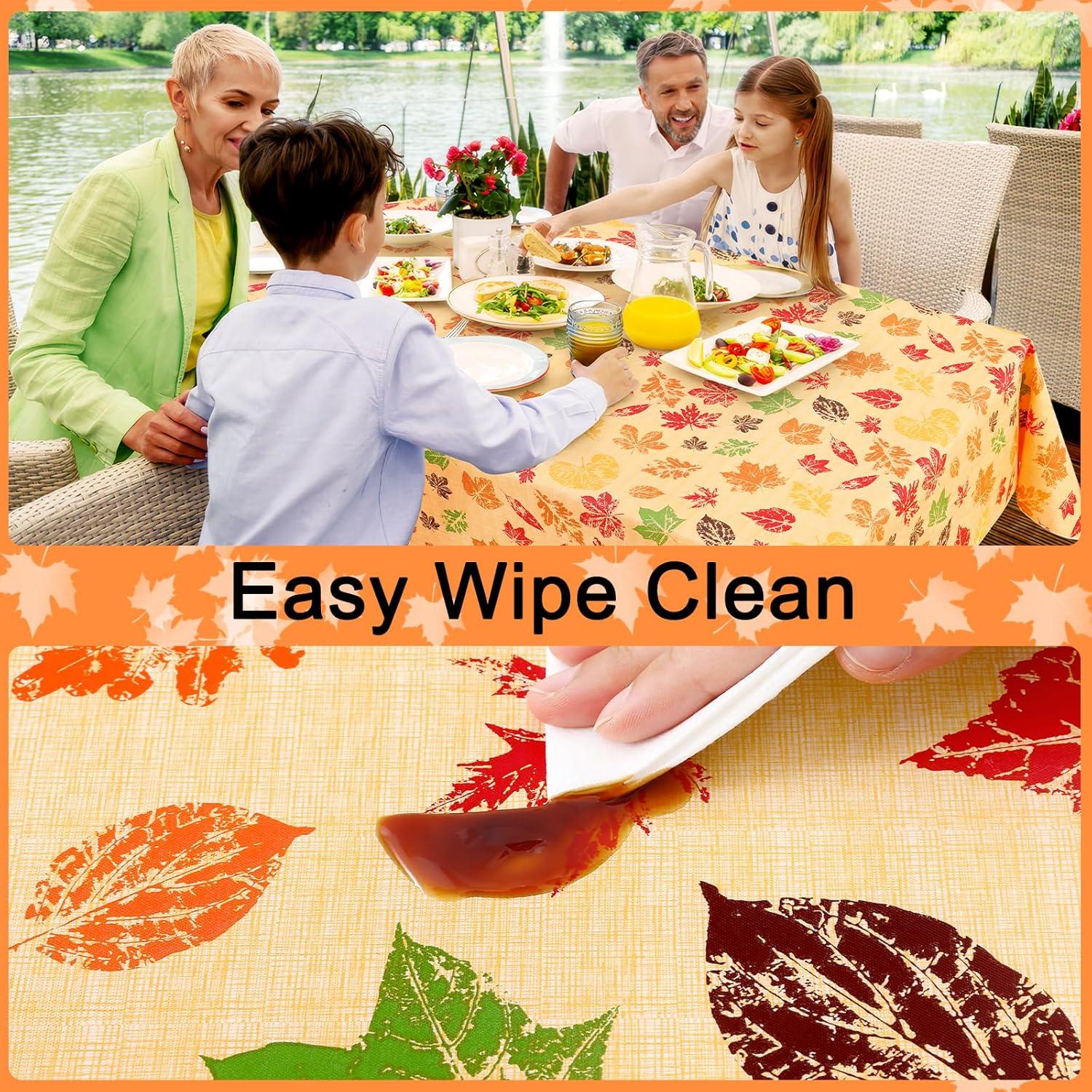 [Waterproof and Wipe Clean] The waterproof vinyl surfaces insulate our table cloths from water, milk, oil and other stains. Just rub with a damp cloth or sponge to remove the stain and look fresh.