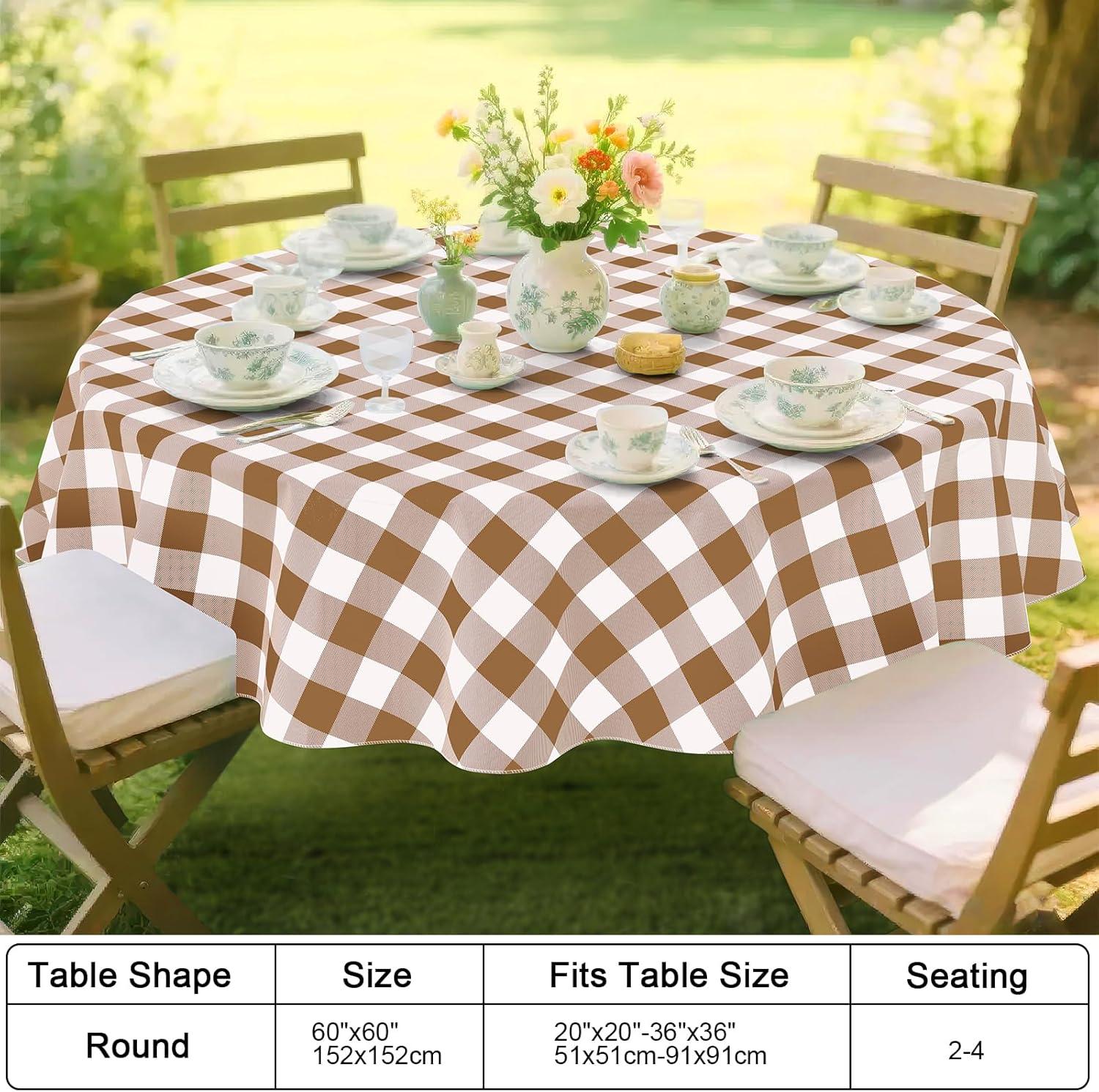 Smiry Round Plastic Table Cloth, Waterproof Vinyl Tablecloth with Flannel Backing, Wipeable Buffalo Plaid Table Cover for Dining, Indoor and Outdoor (Khaki & White, 60" Round)(Brown & White)