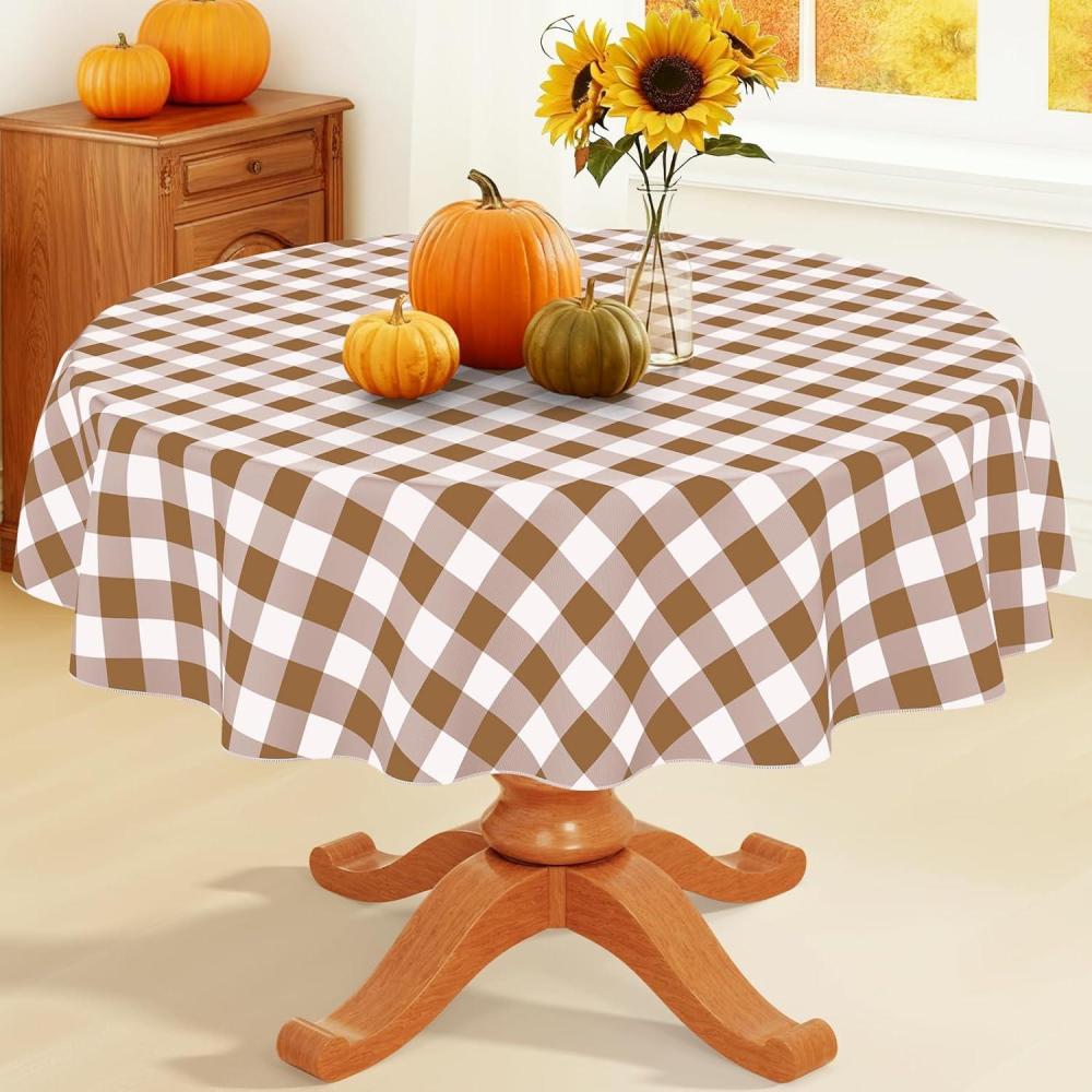 Smiry Round Plastic Table Cloth, Waterproof Vinyl Tablecloth with Flannel Backing, Wipeable Buffalo Plaid Table Cover for Dining, Indoor and Outdoor (Khaki & White, 60″ Round)(Brown & White)