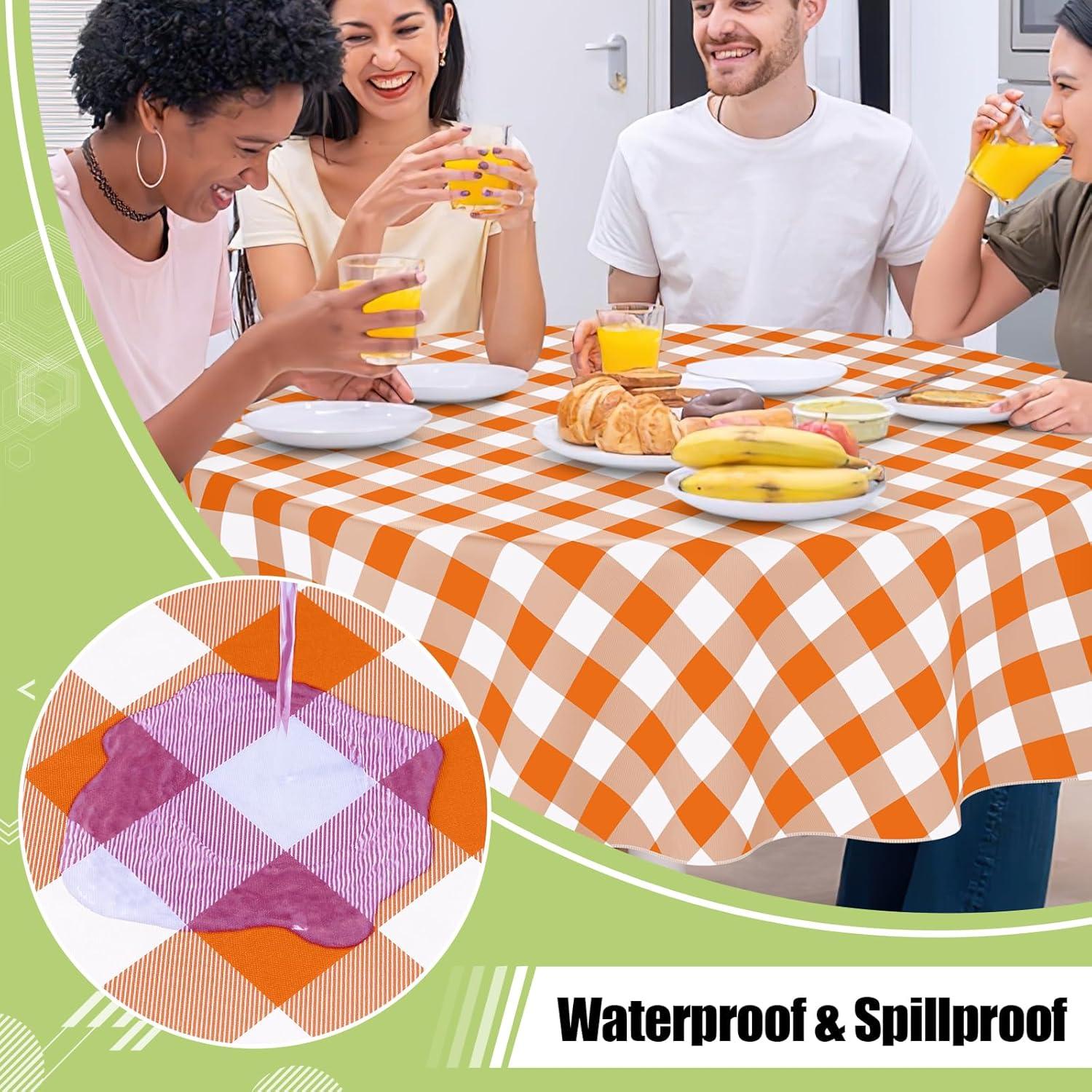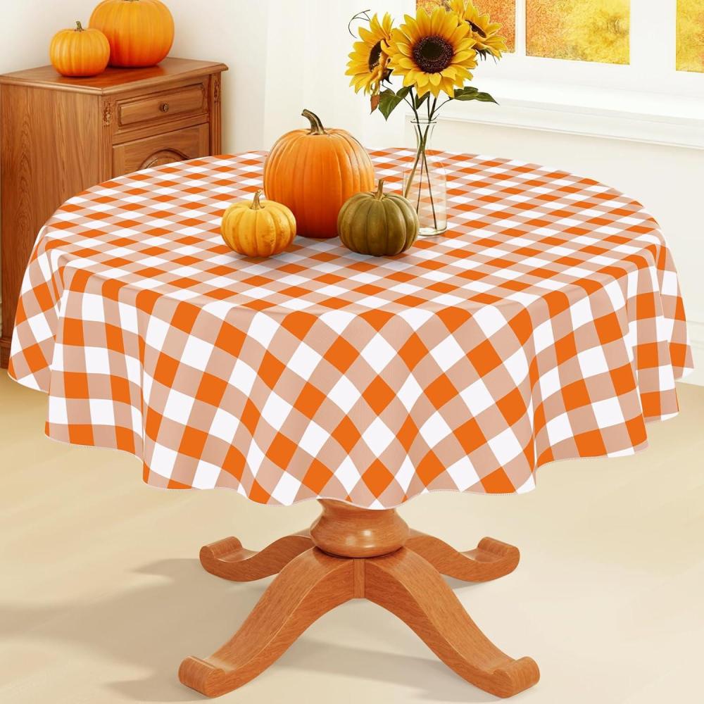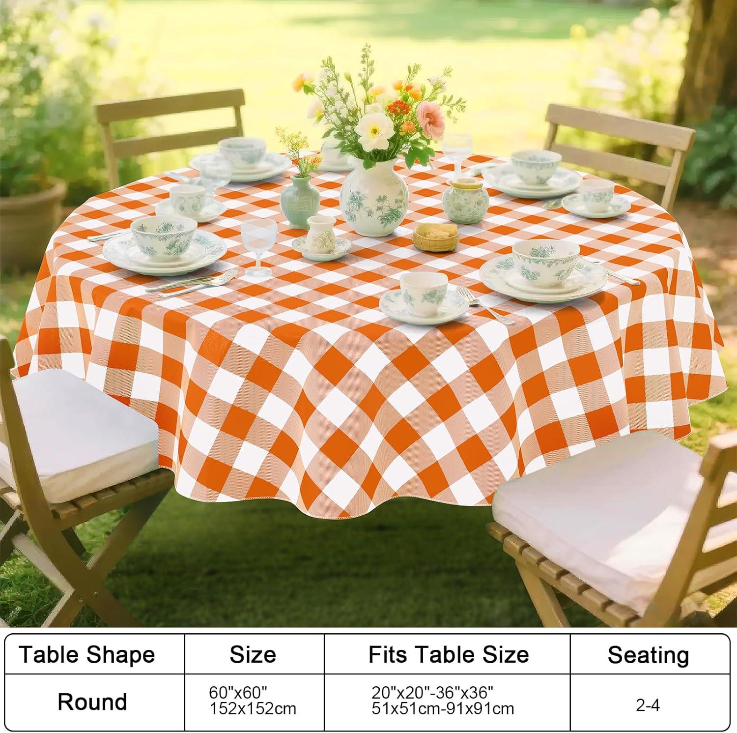 Smiry Round Plastic Table Cloth, Waterproof Vinyl Tablecloth with Flannel Backing, Wipeable Buffalo Plaid Table Cover for Dining, Indoor and Outdoor (Khaki & White, 60″ Round)(Orange & White)