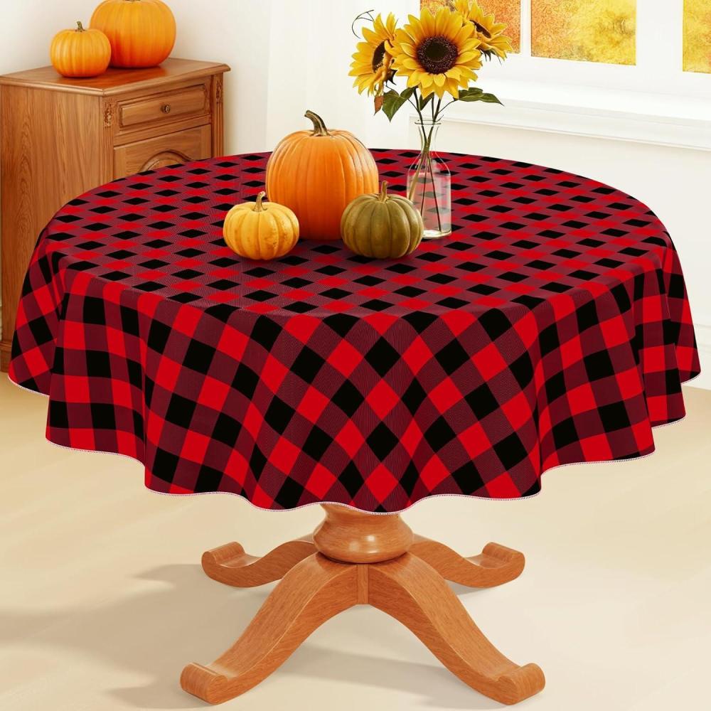 Smiry Round Plastic Table Cloth, Waterproof Vinyl Tablecloth with Flannel Backing, Wipeable Buffalo Plaid Table Cover for Dining, Indoor and Outdoor (Khaki & White, 60″ Round)(Red & Black)