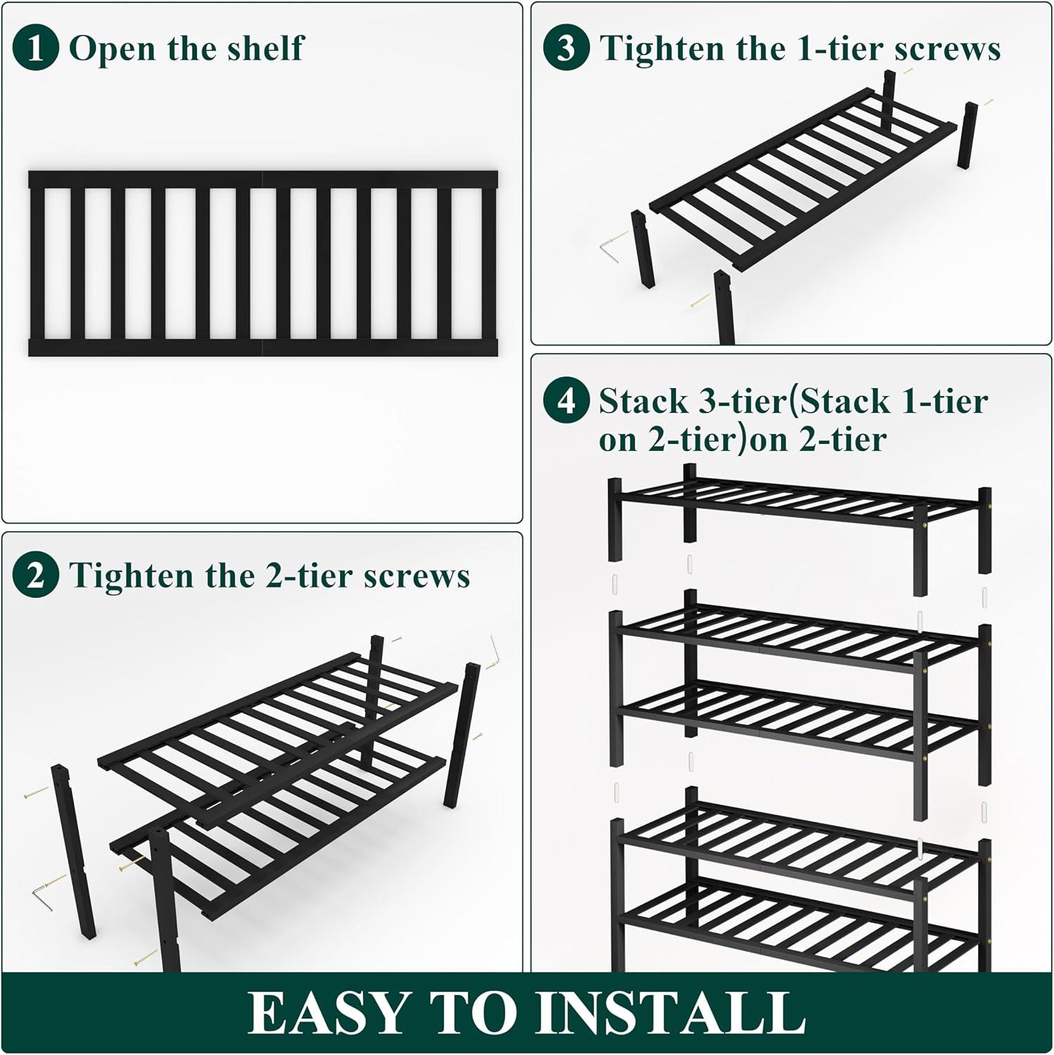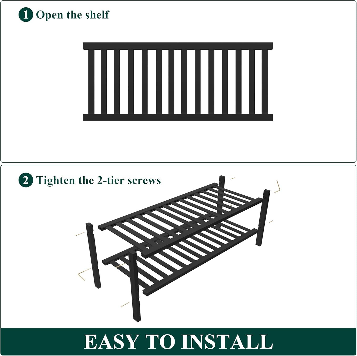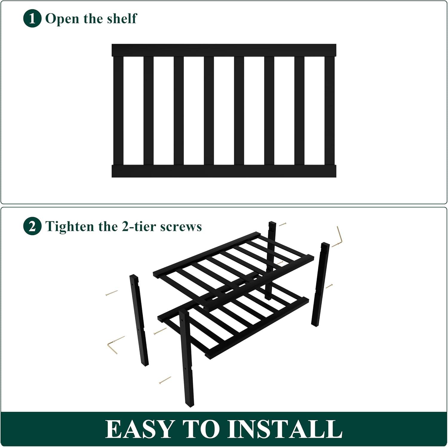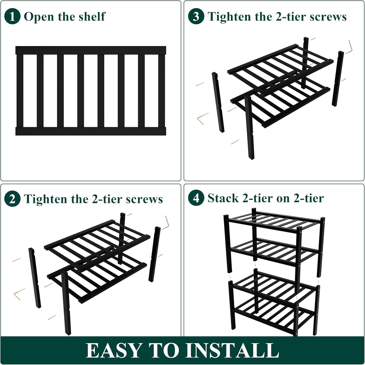 [Stackable & Expandable] The racks can be used separately or stacked together for more storage. Combine 1-tier + 2-tier for 3 tiers, or 2-tier + 2-tier for 4 tiers. Easily expand and customize the configuration to fit your space and needs