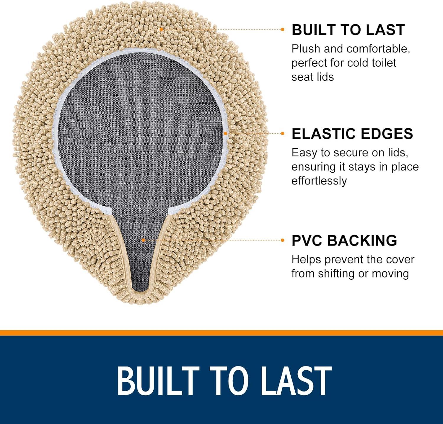 [SOFT AND COMFORTABLE] Plush chenille topside is ultra soft and comfortable to sit on; premium fabric adds an extra layer of comfort while helping to protect your toilet lid from scratches and damage