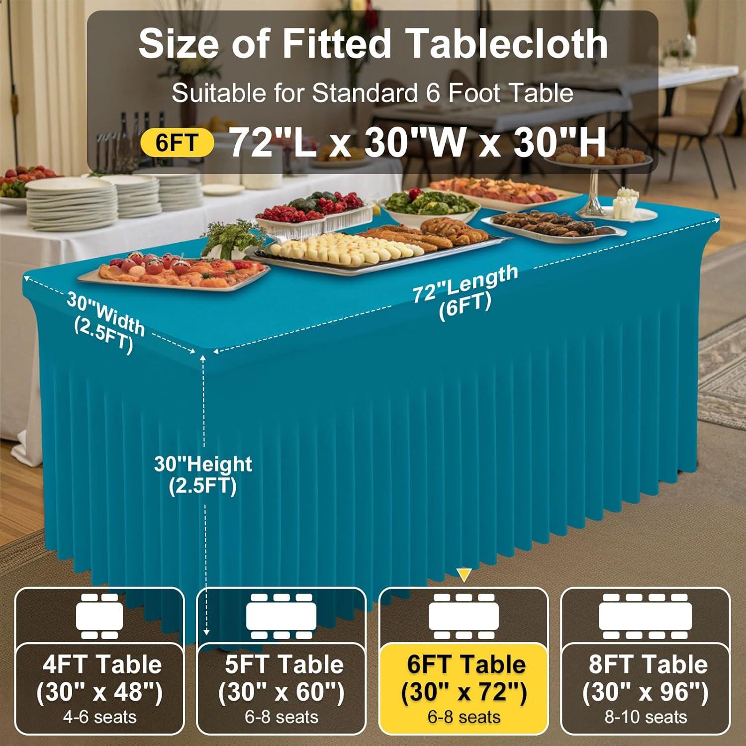 [Measurement] Our banquet tablecloth dimensions for a 6-foot table are 72 inches in length, 30 inches in width, and 30 inches in height. Please measure your table to ensure you choose the appropriate size before making a purchase.