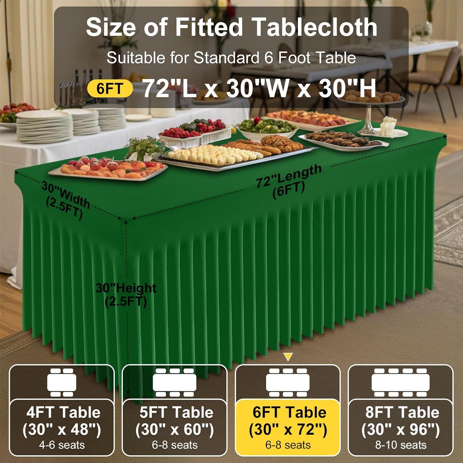 [Measurement] Our banquet tablecloth dimensions for a 6-foot table are 72 inches in length, 30 inches in width, and 30 inches in height. Please measure your table to ensure you choose the appropriate size before making a purchase.