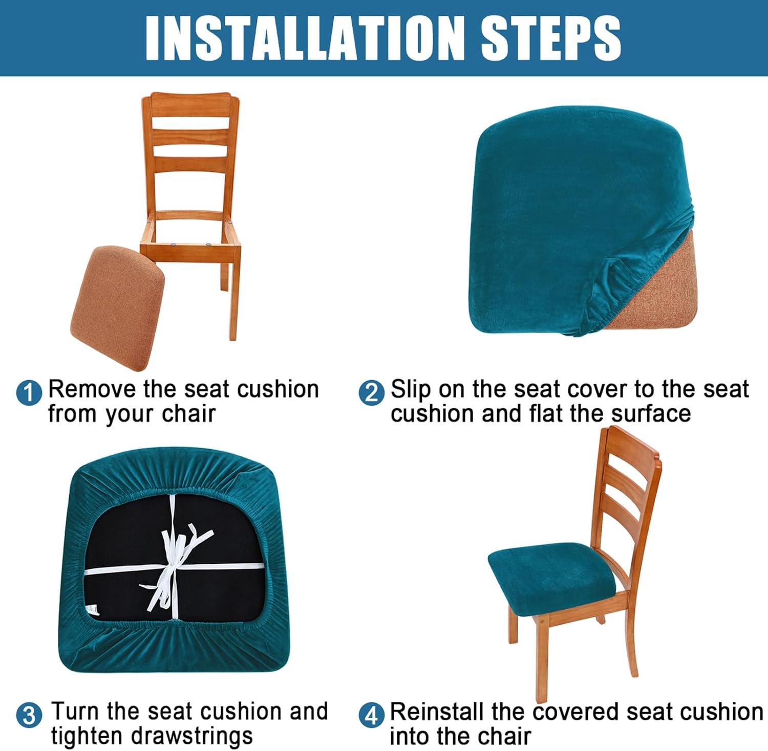[Easy to Install] Dining chair covers are equipped with elastic band and ties, easy to fit and anti-slip. Just remove the seat cushion, slip chair cover gently over the cushion and flat the surfaces, tighten drawstring and reinstall this cushion will perfect fit your chair