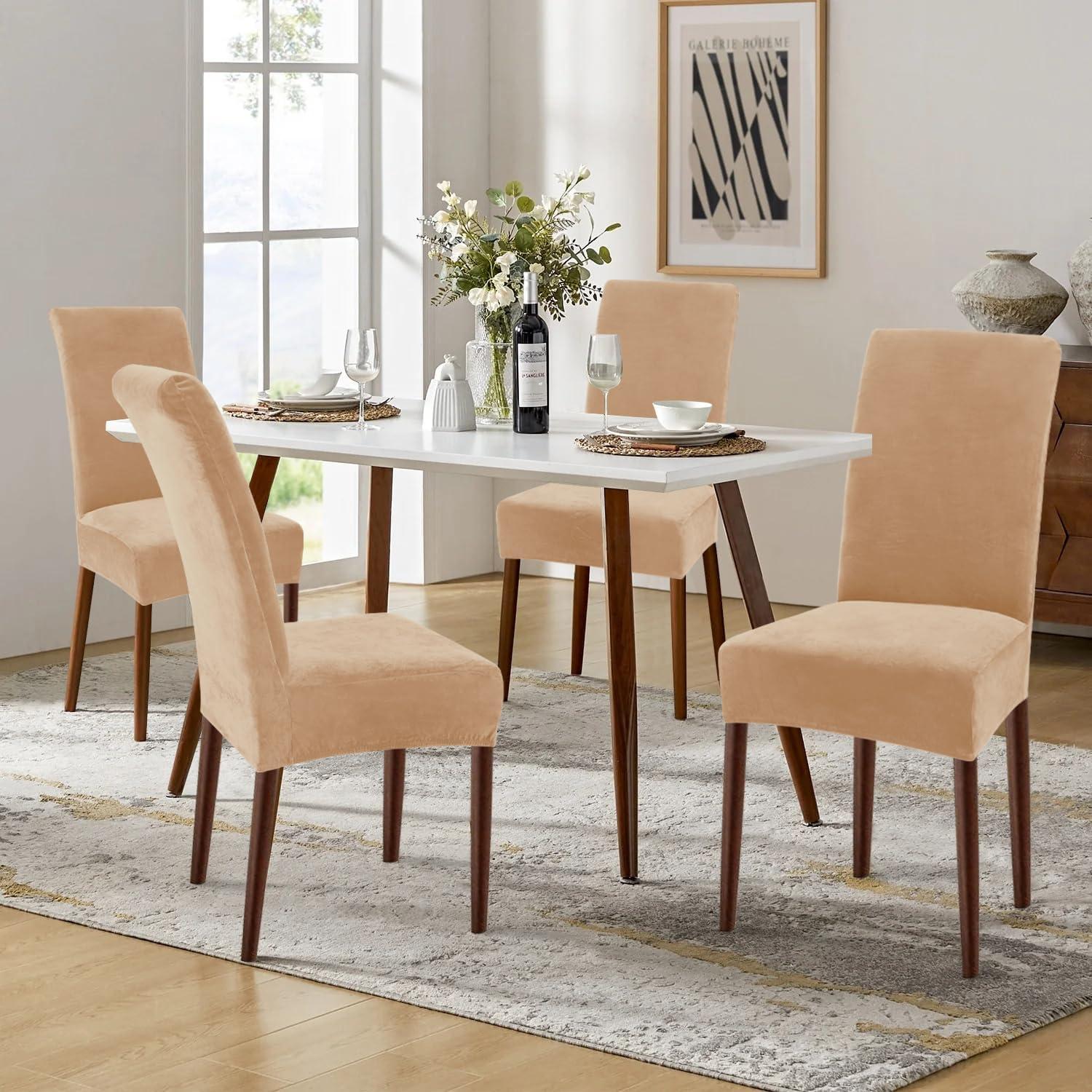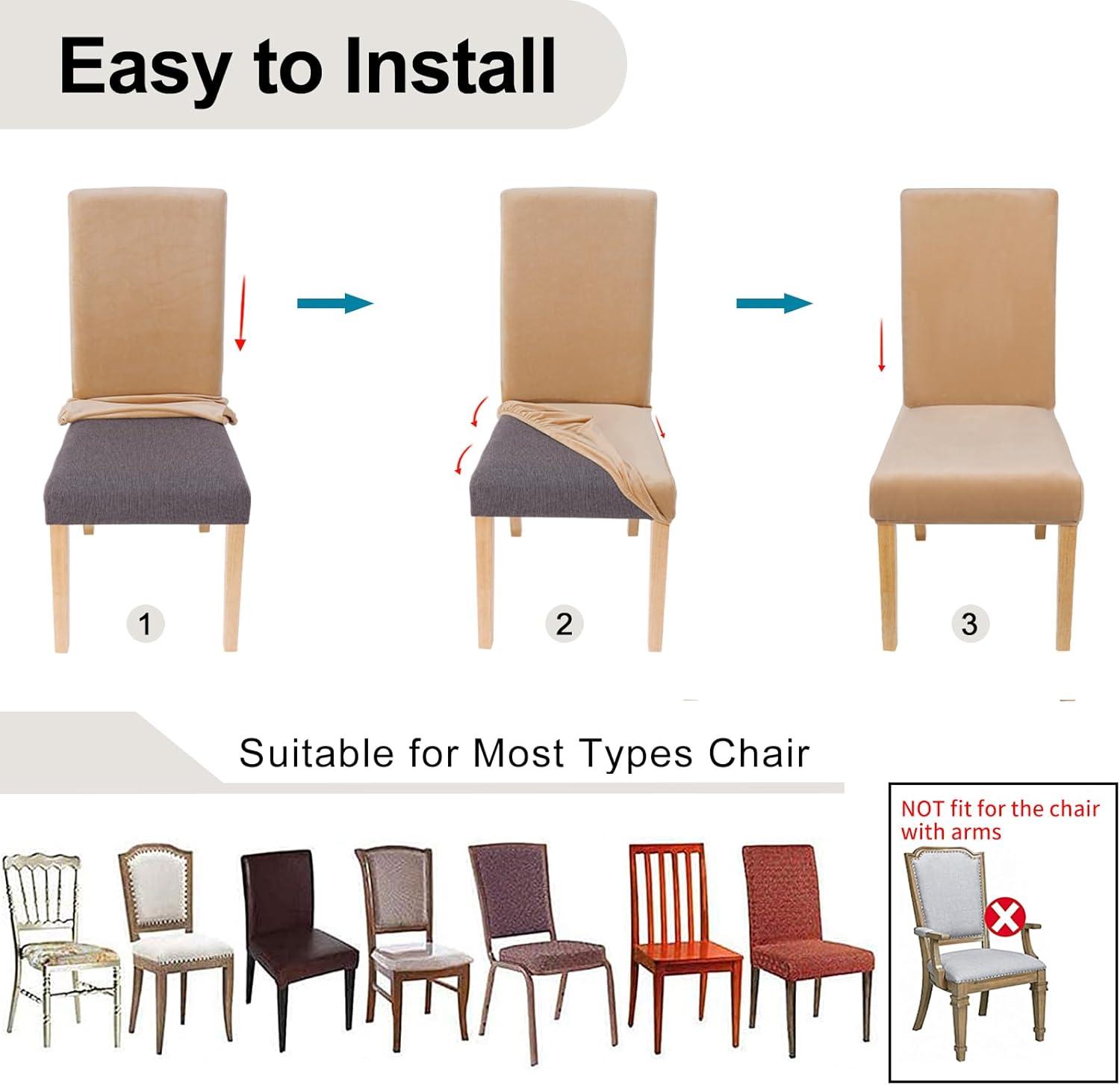 [Perfect Fit] Stretchable thick material velvet chair cover with sewn-in elastic hem ensures the dining chair covers fit securely on your chair, very easy to put on and take off. It covers the chair from the backrest to the seat, fit perfectly on most armless chairs and stay up